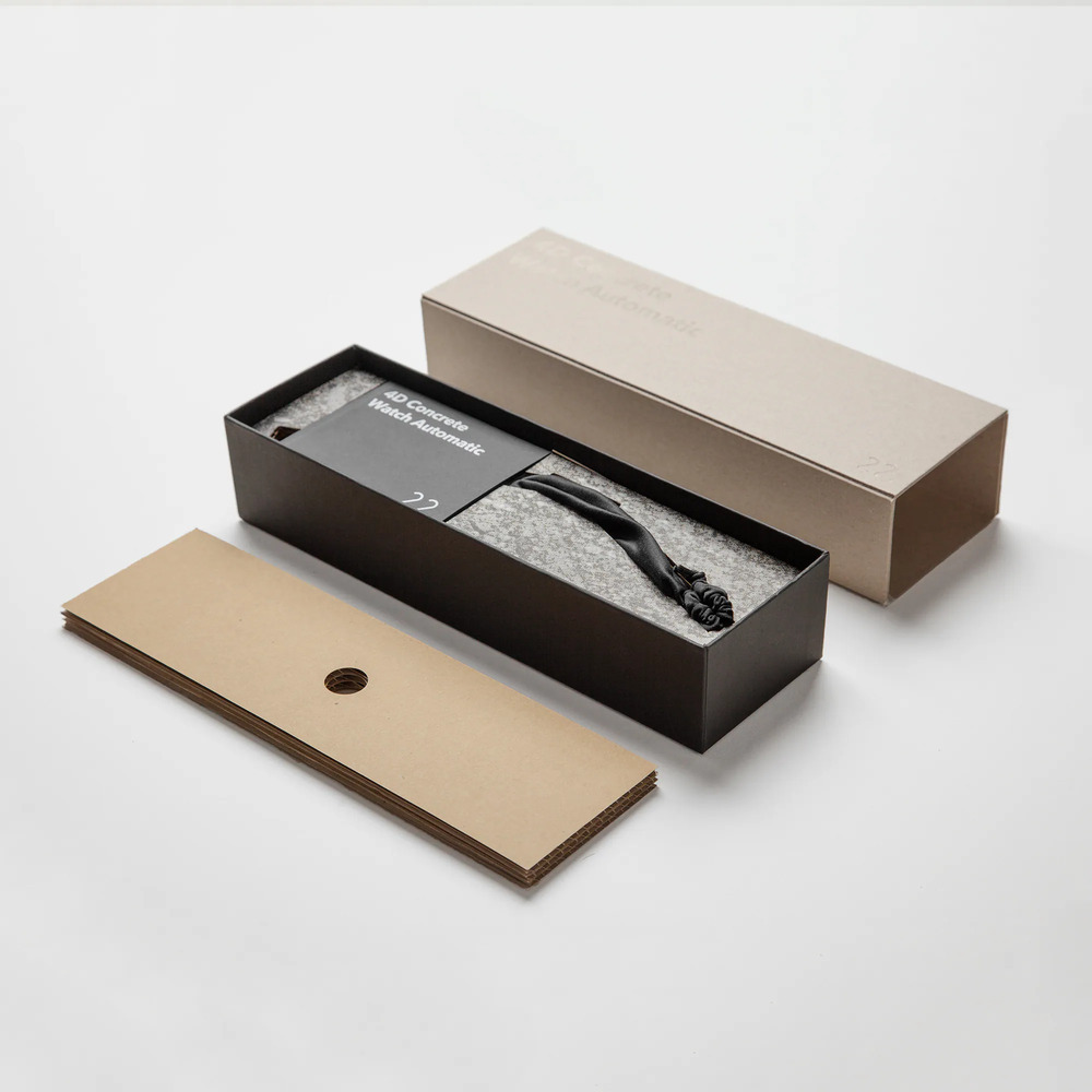 22STUDIO產品的包裝設計,盡可能全部使用紙材製作,展現各種紙材原本的個性。最外層是灰色的紙板,使用厚的灰紙板鍘半斷折成圍套,內層使用層層堆疊的防震性回收紙漿瓦愣紙,手錶將會放入專屬防塵袋後再放入錶盒中。