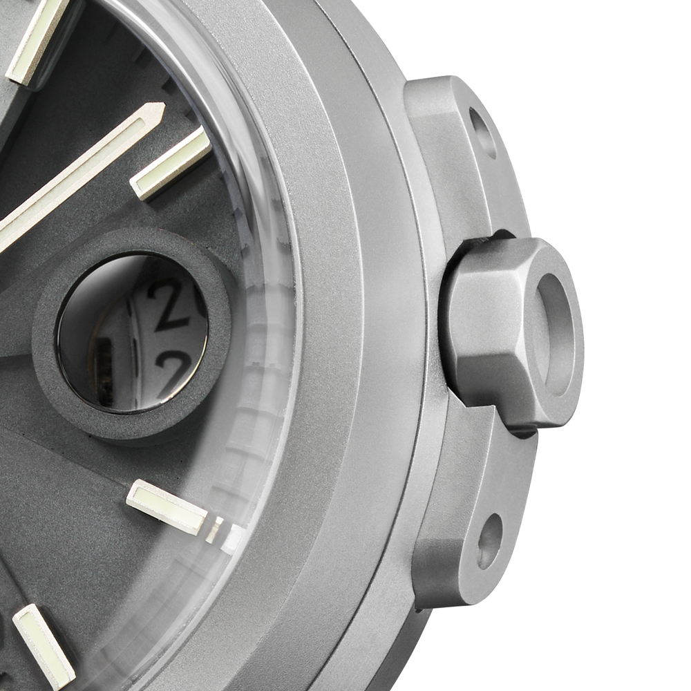 護肩式錶冠設計,在原本的錶冠周圍CNC出一凹槽,鎖上龍頭護弓,設立保護屏障。讓錶冠能減少第一線的劇烈碰撞,延長腕錶的使用壽命,從事較大動作活動時也能安心配戴。工藝細節也讓整體造型更富運動靈魂與機械美感。