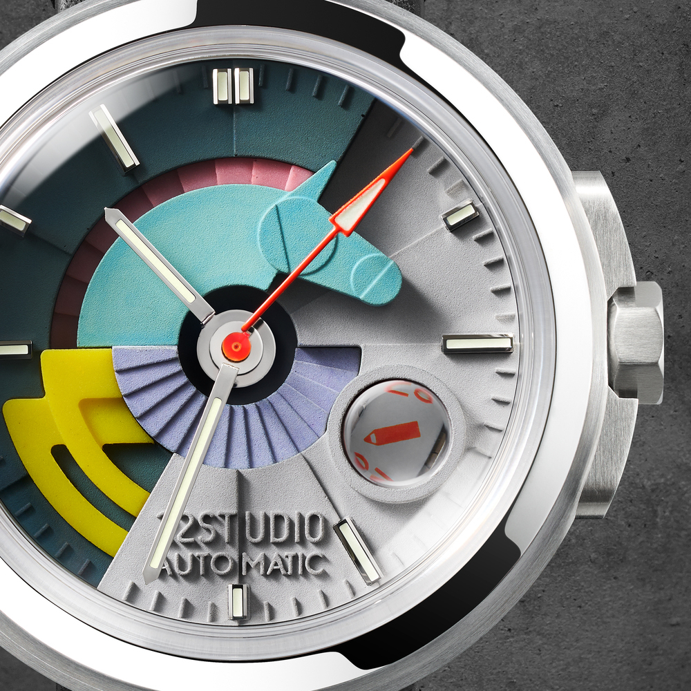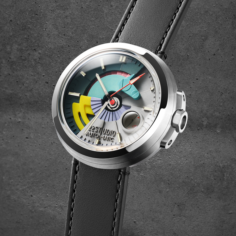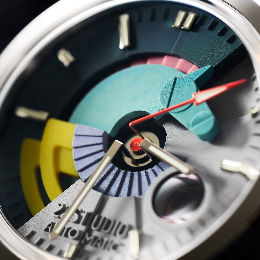霓彩款以 22STUDIO 最具代表性的水泥配色語彙,轉譯至機械錶之上。深淺灰高密度清水模錶盤,結合多彩幾何構圖,彷彿走進動畫世界的想像場景——輕盈、跳躍,卻依然保有水泥的沉著質地。
