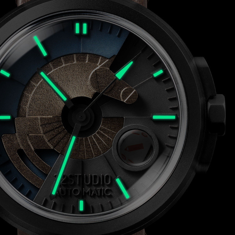 又是另一個22STUDIO的原創設計,我們利用旋轉樓梯造型錶面多出來的內部空間,我們於清水模錶盤上設計出一井狀日期窗,再把一般黏合在錶面玻璃的日期放大鏡轉移安裝到井的上緣,清晰顯示日期,形成豐富的趣味。
