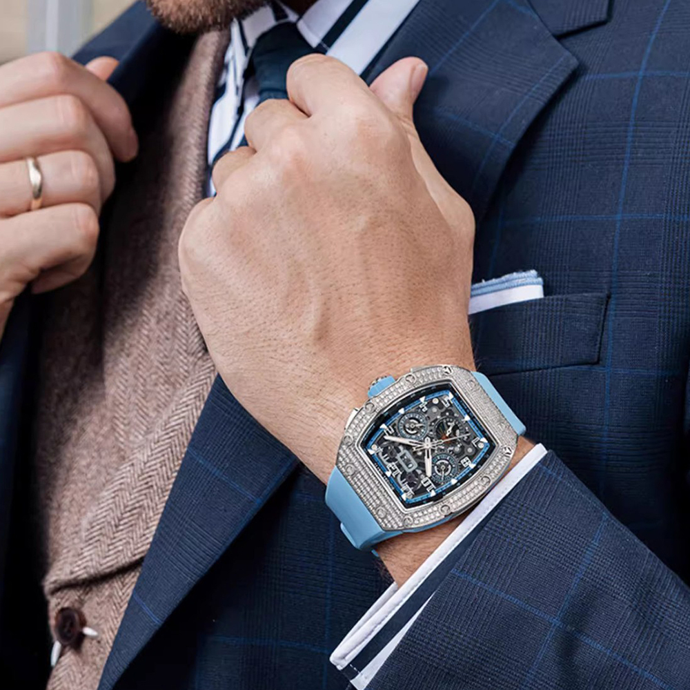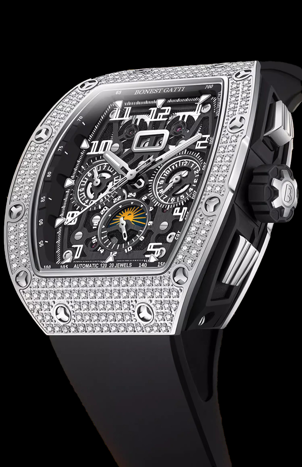 Bonest Gatti 寶加地【尊爵魅影】系列延續「魅影系列」廣受好評的酒桶形錶殼,整體視覺以浪漫星空為繆思,在酒桶形錶殼上鑲嵌璀璨水鑽,做工繁複而細膩,讓原本陽剛率性的運動錶款散發出不同的優雅氣息! 除了耀眼奢華的鑲鑽外框,【尊爵魅影】亦搭載多功能自動上鍊機芯,時、分、秒、日期、月份、星期與日月星辰等多項設計,讓腕錶不再只是腕錶、而是一項兼具實用與美學的工藝傑作!