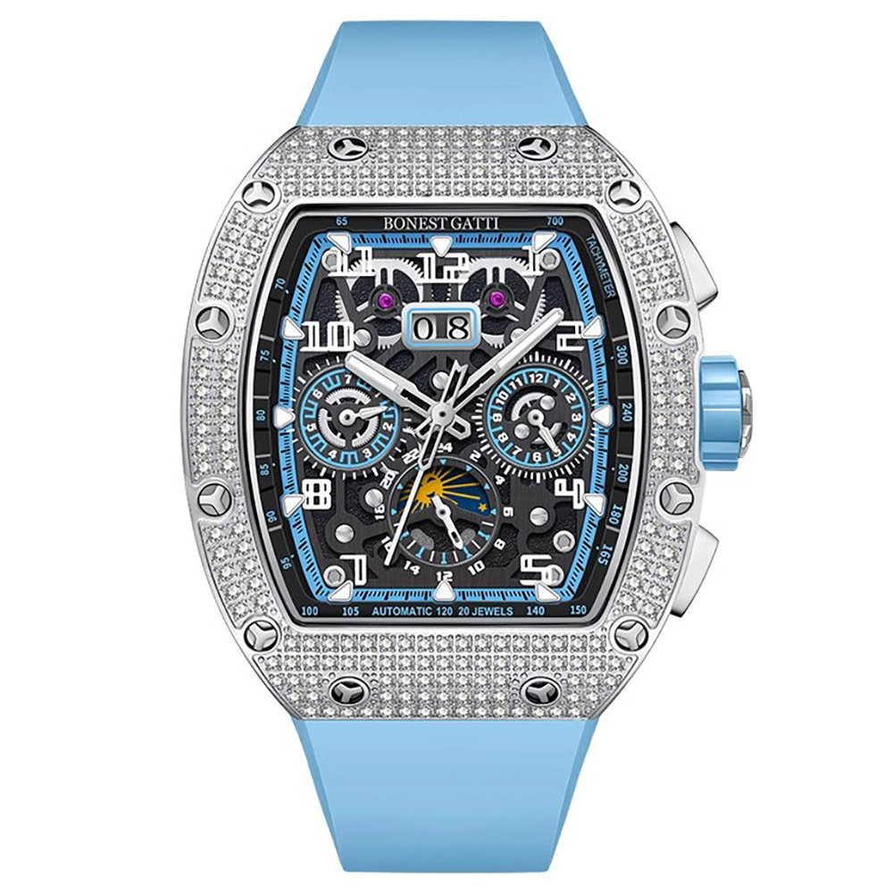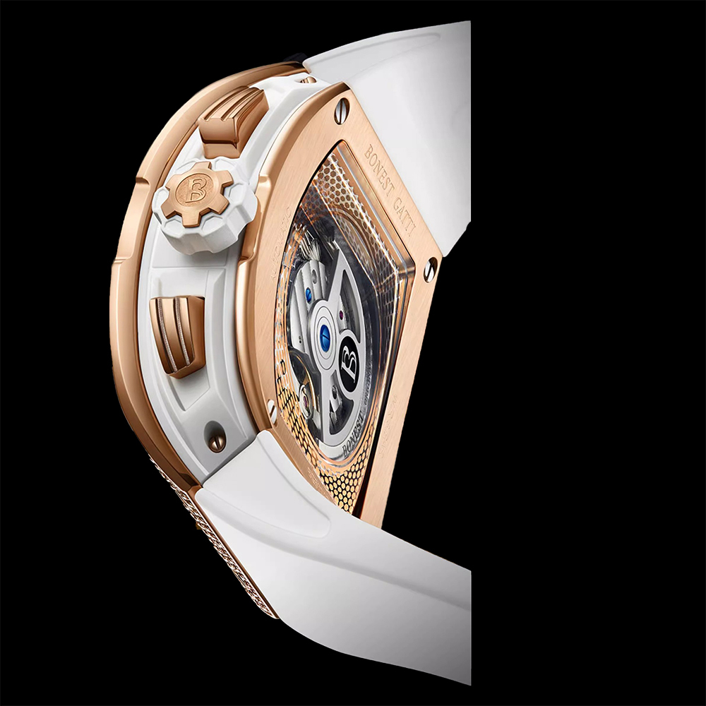 Bonest Gatti 寶加地【尊爵魅影】系列延續「魅影系列」廣受好評的酒桶形錶殼,整體視覺以浪漫星空為繆思,在酒桶形錶殼上鑲嵌璀璨水鑽,做工繁複而細膩,讓原本陽剛率性的運動錶款散發出不同的優雅氣息! 除了耀眼奢華的鑲鑽外框,【尊爵魅影】亦搭載多功能自動上鍊機芯,時、分、秒、日期、月份、星期與日月星辰等多項設計,讓腕錶不再只是腕錶、而是一項兼具實用與美學的工藝傑作!