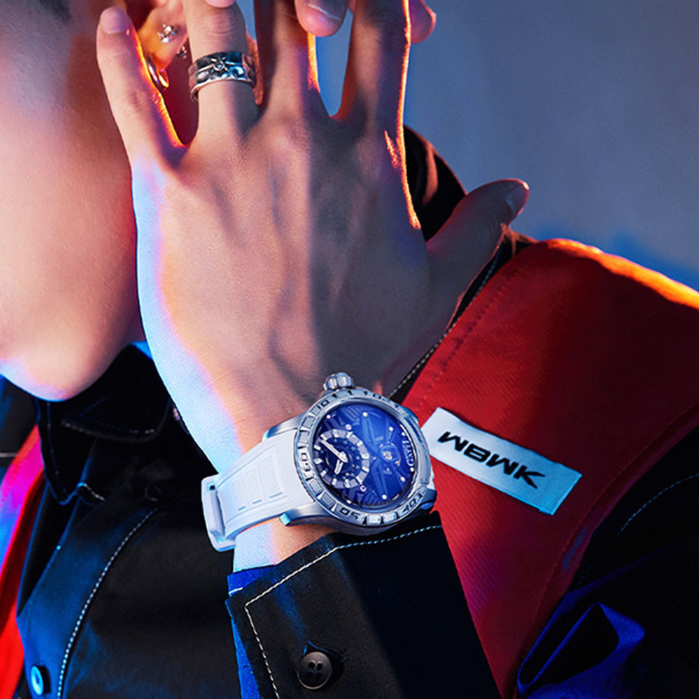 勇於嘗試,【幽游競技】系列以鏤空機芯呈現,讓運動錶有了截然不同的味道。鏤空機芯的線條感來自超跑的流線元素,而大膽前衛的撞色與層層堆疊的錶盤設計,更是將機械美學展現的淋漓盡致!