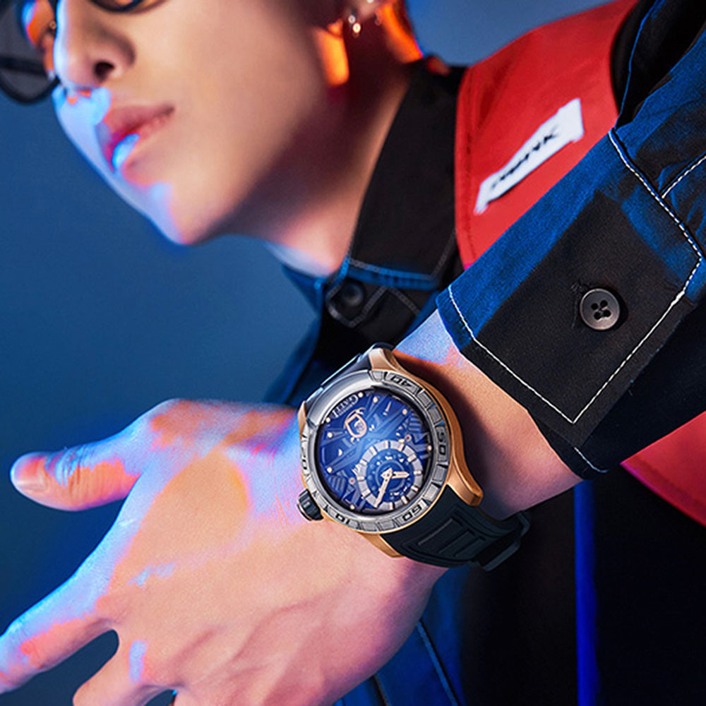 勇於嘗試,【幽游競技】系列以鏤空機芯呈現,讓運動錶有了截然不同的味道。鏤空機芯的線條感來自超跑的流線元素,而大膽前衛的撞色與層層堆疊的錶盤設計,更是將機械美學展現的淋漓盡致!