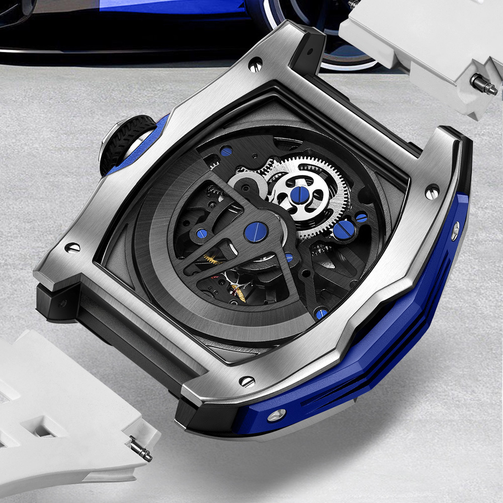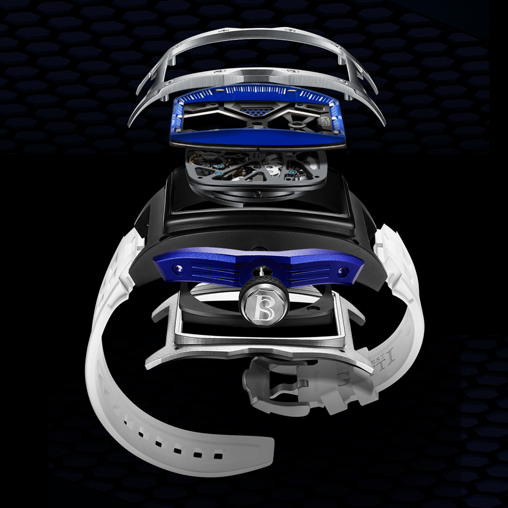 BONEST GATTI 寶加地【Circuit賽道遊俠】腕錶搭配極具潮流的酒桶型錶殼,並以充滿賽車風格的鏤空面盤呈現。整體設計融合多項賽車的外觀元素,在視覺上彷彿於正前方俯視車身,面盤四個角落上的鏤空對應造型突出的四輪輪拱,中央網格的部分是車身前方大型的網狀水箱護罩,6點鐘方向的擺輪則象徵賽車動力來源的引擎。