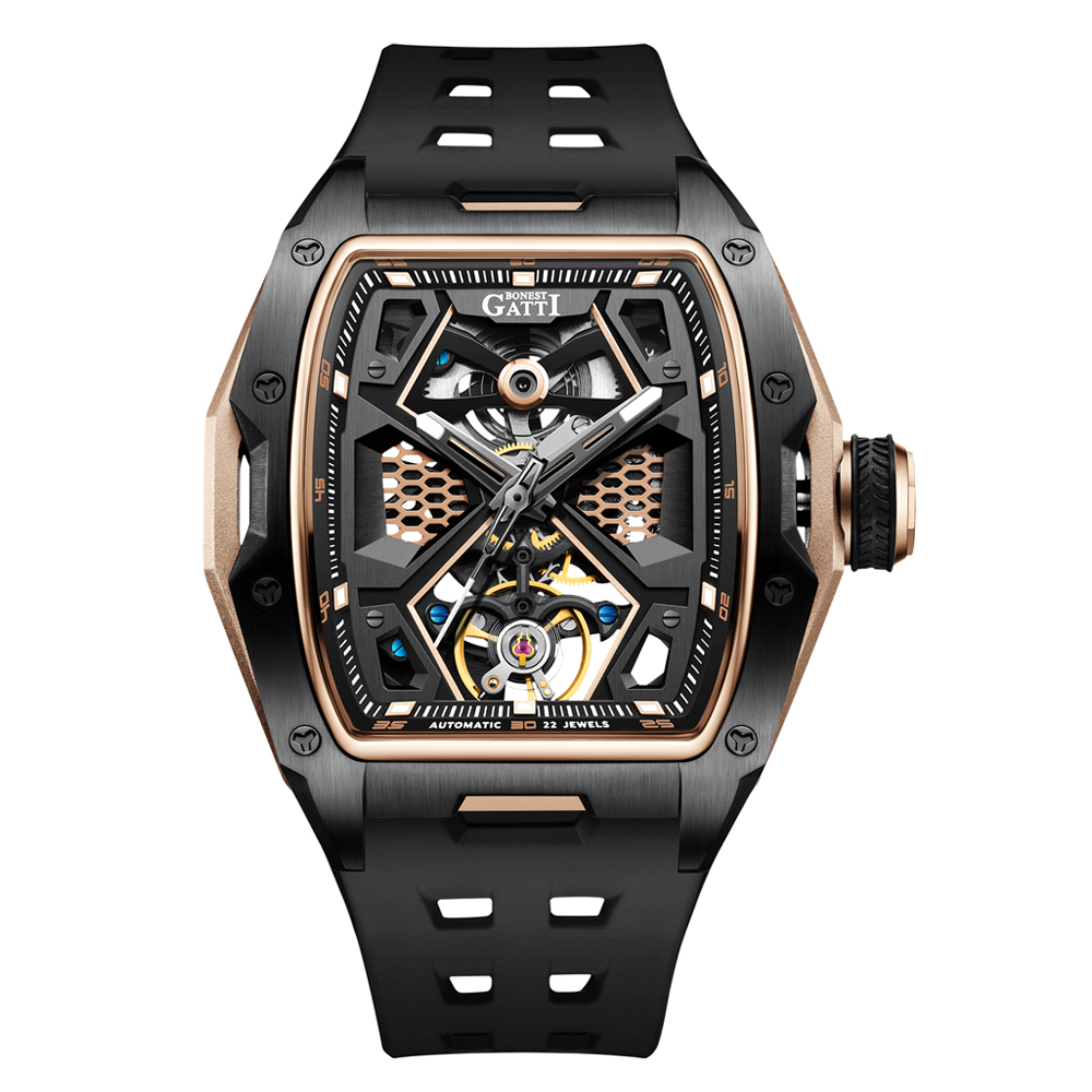 BONEST GATTI 寶加地【Circuit賽道遊俠】腕錶搭配極具潮流的酒桶型錶殼,並以充滿賽車風格的鏤空面盤呈現。整體設計融合多項賽車的外觀元素,在視覺上彷彿於正前方俯視車身,面盤四個角落上的鏤空對應造型突出的四輪輪拱,中央網格的部分是車身前方大型的網狀水箱護罩,6點鐘方向的擺輪則象徵賽車動力來源的引擎。