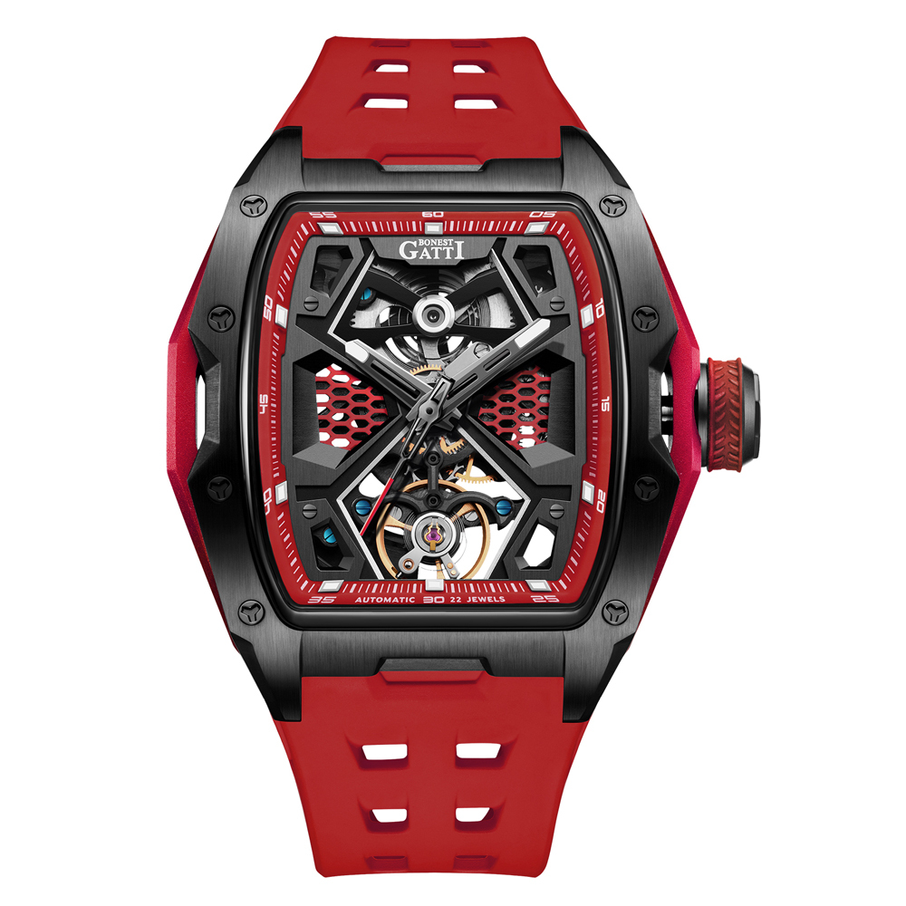 Bonest Gatti 【寶加地腕錶】Circuit 賽道系列在造型上延續極具潮流的酒桶型錶殼,並以充滿工業風格的鏤空面盤呈現。錶身的線條取材於賽車的流線型設計,中殼的部分向外突出,靈感來自於賽車四輪較車身更寬的設計,錶冠在此也順勢化身為賽車車輪,上下兩側色彩鮮豔的中殼則成為輪弧旁的葉子板。錶冠包覆一層賽車車胎的紋路的橡膠,當上鍊或調整時間時,就如同車輪轉動般擬真。