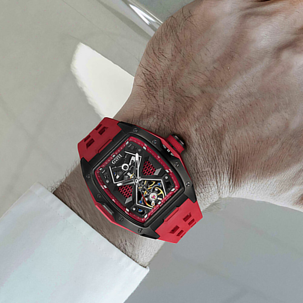 BONEST GATTI 寶加地【Circuit賽道遊俠】腕錶搭配極具潮流的酒桶型錶殼,並以充滿賽車風格的鏤空面盤呈現。整體設計融合多項賽車的外觀元素,在視覺上彷彿於正前方俯視車身,面盤四個角落上的鏤空對應造型突出的四輪輪拱,中央網格的部分是車身前方大型的網狀水箱護罩,6點鐘方向的擺輪則象徵賽車動力來源的引擎。