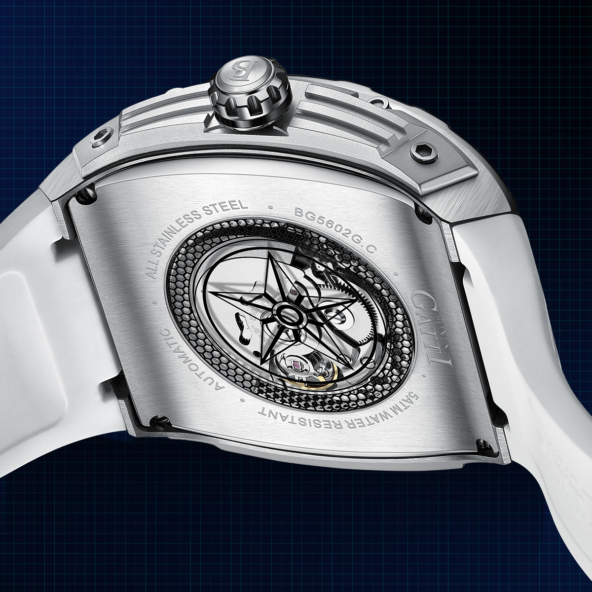 【都會競技】系列也同樣擁有機械錶迷最愛的透視底蓋,自動盤同樣以鏤空方式讓內外有著相同的視覺效果,而鏤空的自動盤就像是超跑的輪圈盤,轉動時就如同一台超跑在腕間奔馳般。