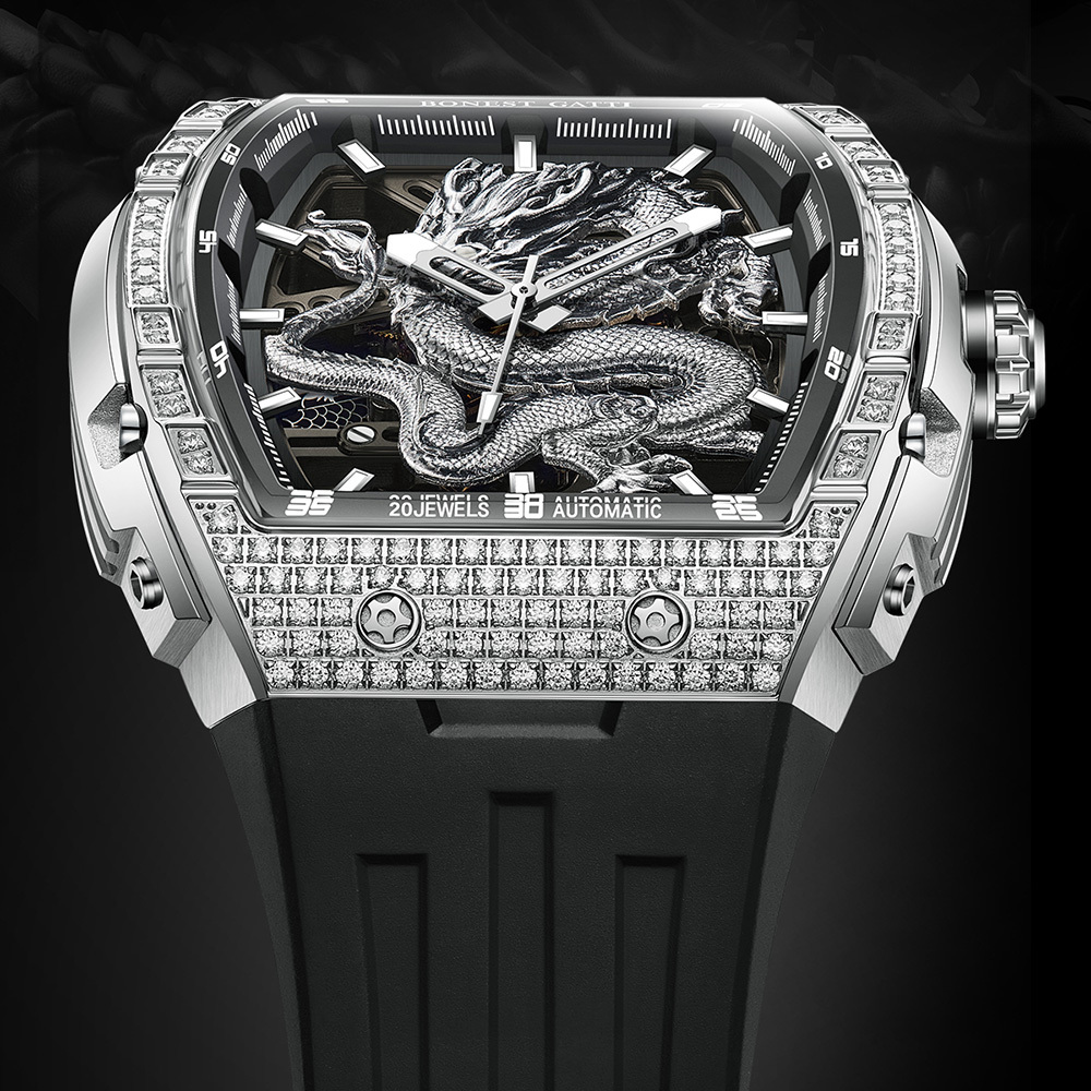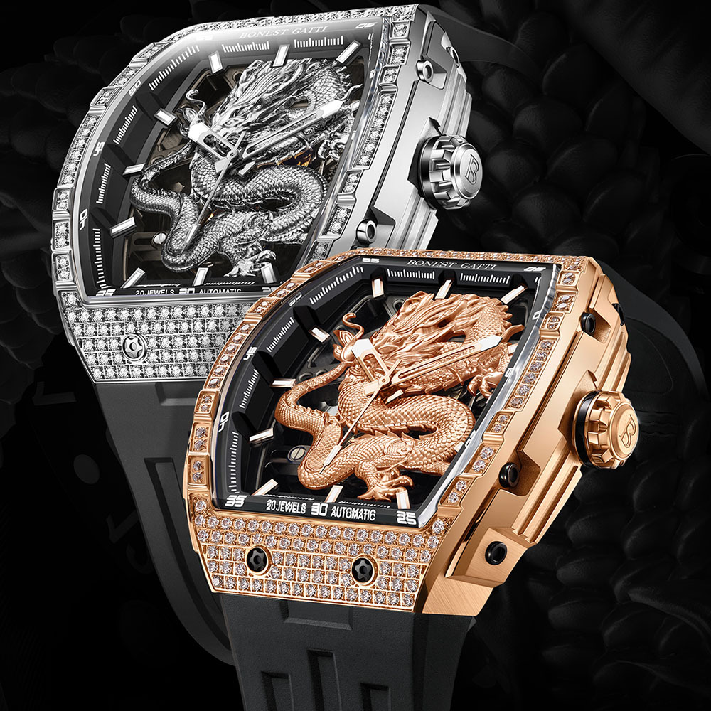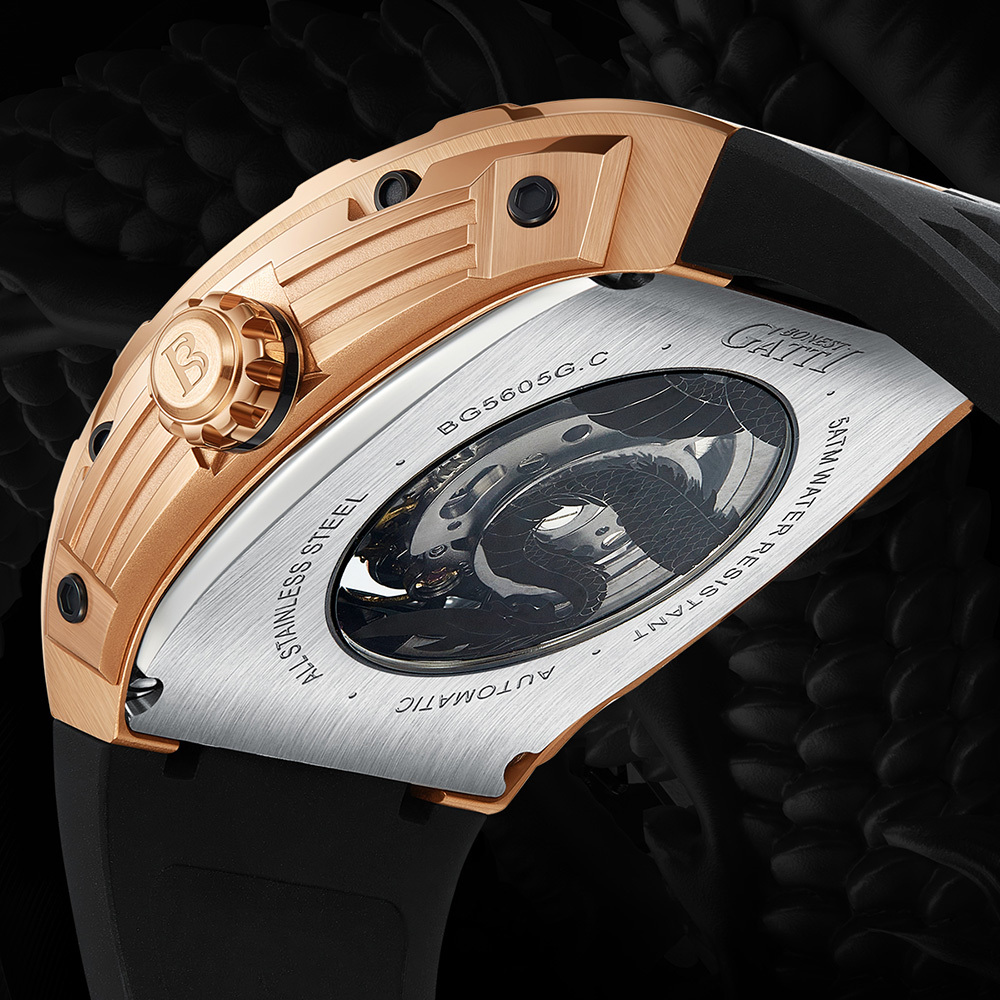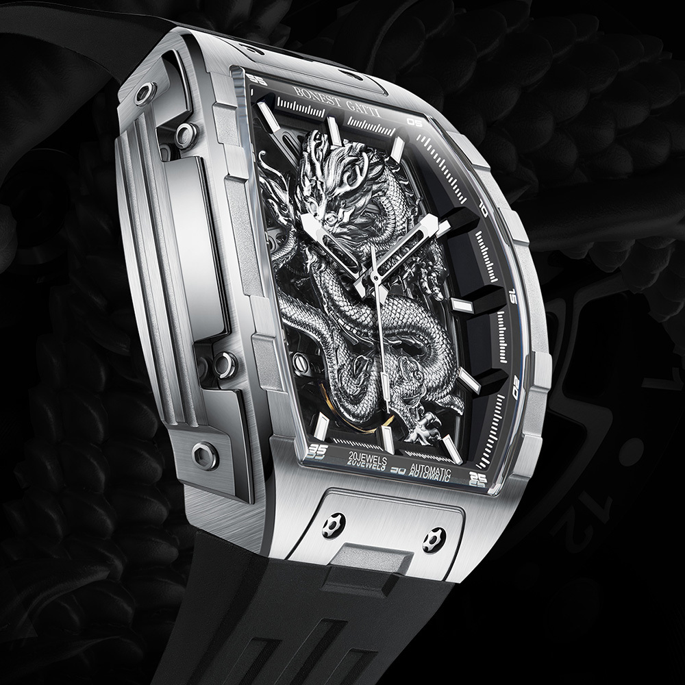 Bonest Gatti 【騰龍系列】延續「都會系列」廣受好評的酒桶形錶殼,錶面設計為蟠龍騰雲駕霧,神動形移,似欲破錶而出,指針的尖頭採用夜光塗層,時分針運作時如同赤焰龍珠,環繞升龍而行;畫龍點睛,雙目綴以夜光漆,瞠目張頷,威風凜然。