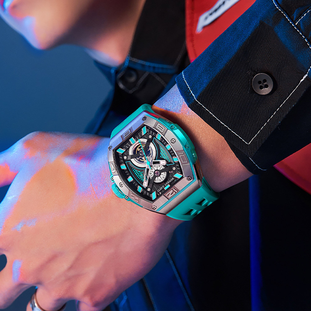 Bonest Gatti 【寶加地腕錶】Circuit 賽道系列在造型上延續極具潮流的酒桶型錶殼,並以充滿工業風格的鏤空面盤呈現。錶身的線條取材於賽車的流線型設計,中殼的部分向外突出,靈感來自於賽車四輪較車身更寬的設計,錶冠在此也順勢化身為賽車車輪,上下兩側色彩鮮豔的中殼則成為輪弧旁的葉子板。錶冠包覆一層賽車車胎的紋路的橡膠,當上鍊或調整時間時,就如同車輪轉動般擬真。