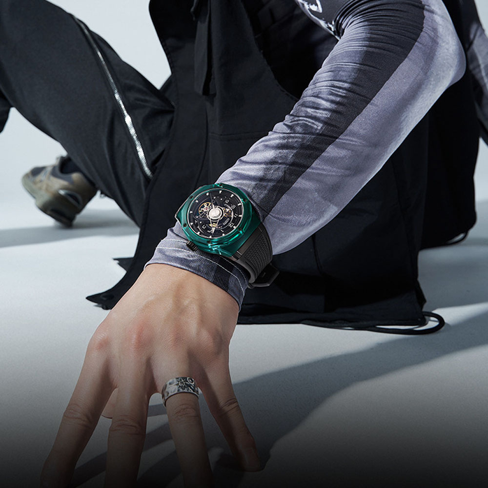 勇於嘗試,【銀河競技】系列以鏤空機芯呈現,讓運動錶有了截然不同的味道。鏤空機芯的線條感來自超跑的流線元素,而大膽前衛的撞色與層層堆疊的錶盤設計,更是將機械美學展現的淋漓盡致!