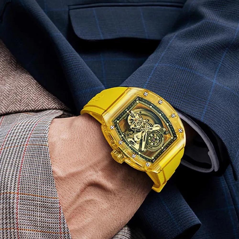敢於別人所不敢的嘗試,【晶鑽陀飛輪】系列以鏤空機芯呈現,讓運動錶有了截然不同的味道。鏤空機芯的線條感來自超跑的流線元素,而大膽前衛的撞色與層層堆疊的錶盤設計,更是將機械美學展現的淋漓盡致!