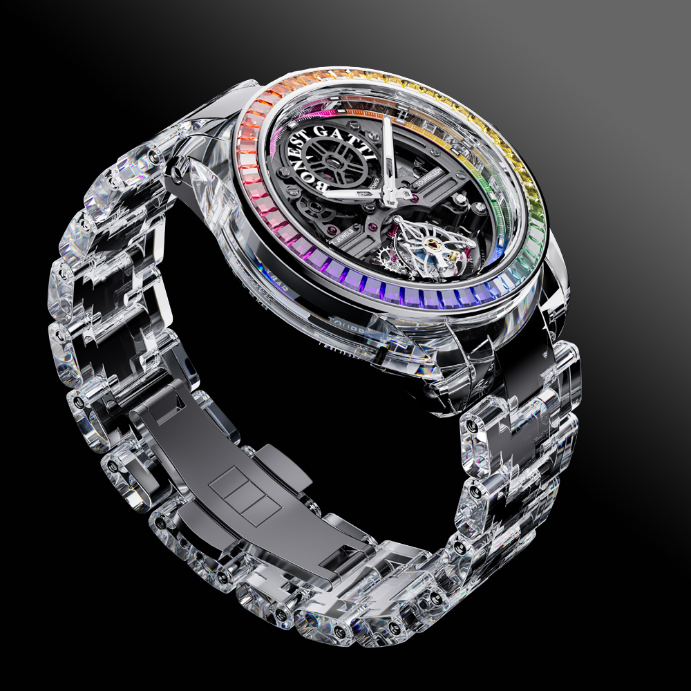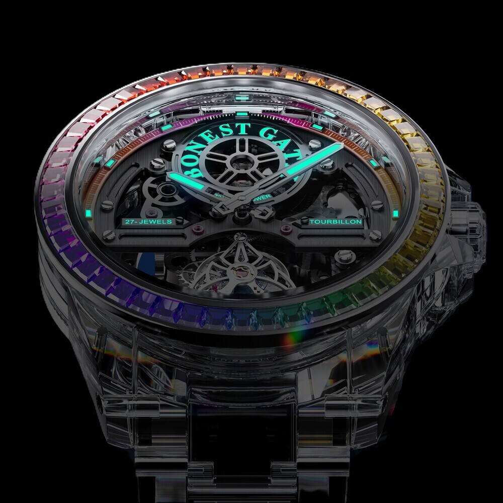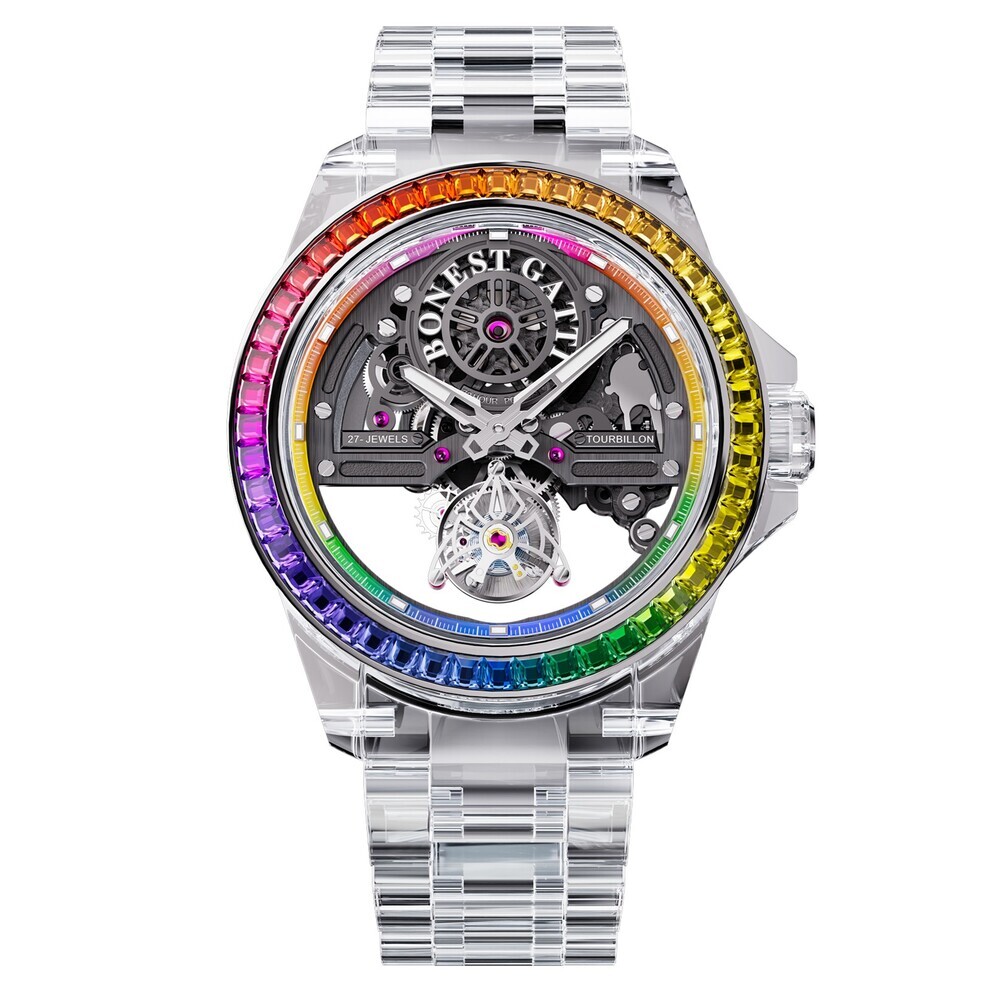 Bonest Gatti 寶加地【彩虹陀飛輪系列】以顛覆性的全透表殼設計,打破人與機械之間的界限,讓時間不再只是被讀取,而能被看見、被感受、被駕馭。透出新視界,重塑時間輪廓。大膽採用整體高強度透明水晶玻璃打造錶殼與錶帶,透徹無瑕的光澤仿若漂浮於空氣中的時光立體模型。不論是手腕翻轉之間的光線折射,或是錶面下機芯轉動的機械律動,都被水晶包覆出一種幾近超現實的感官體驗。當機械不再被隱藏,當光影成為語言,陀飛輪二代 — 運行於腕間的宇宙。