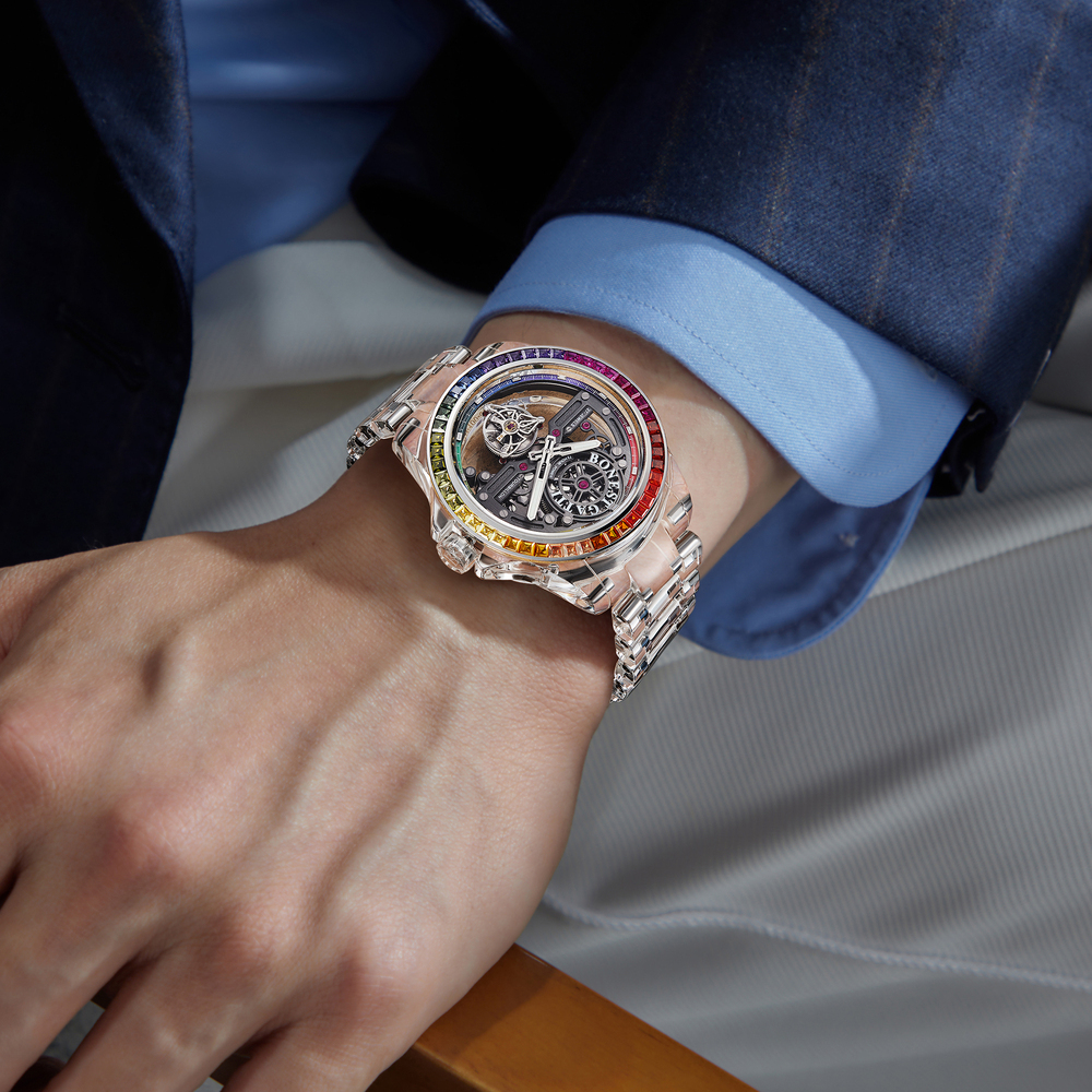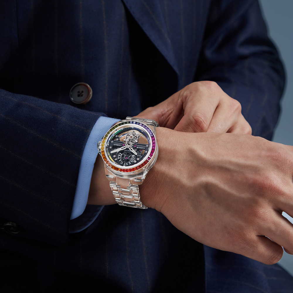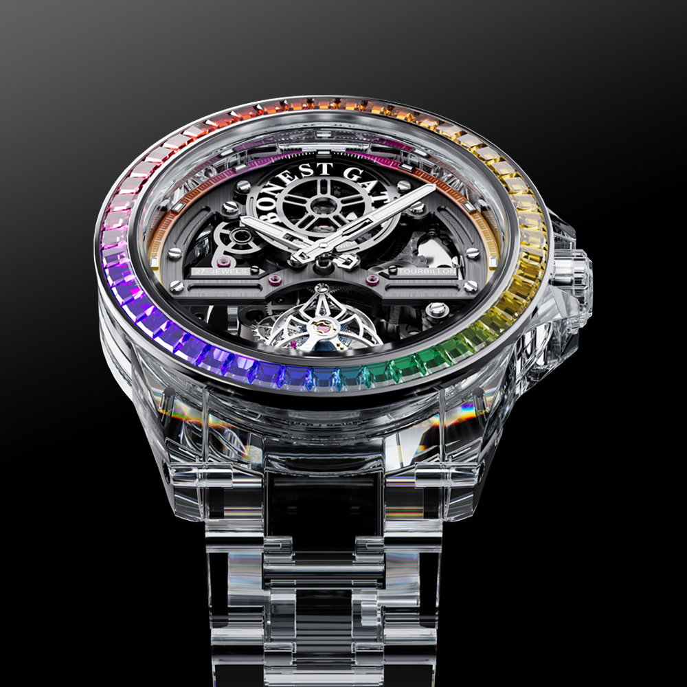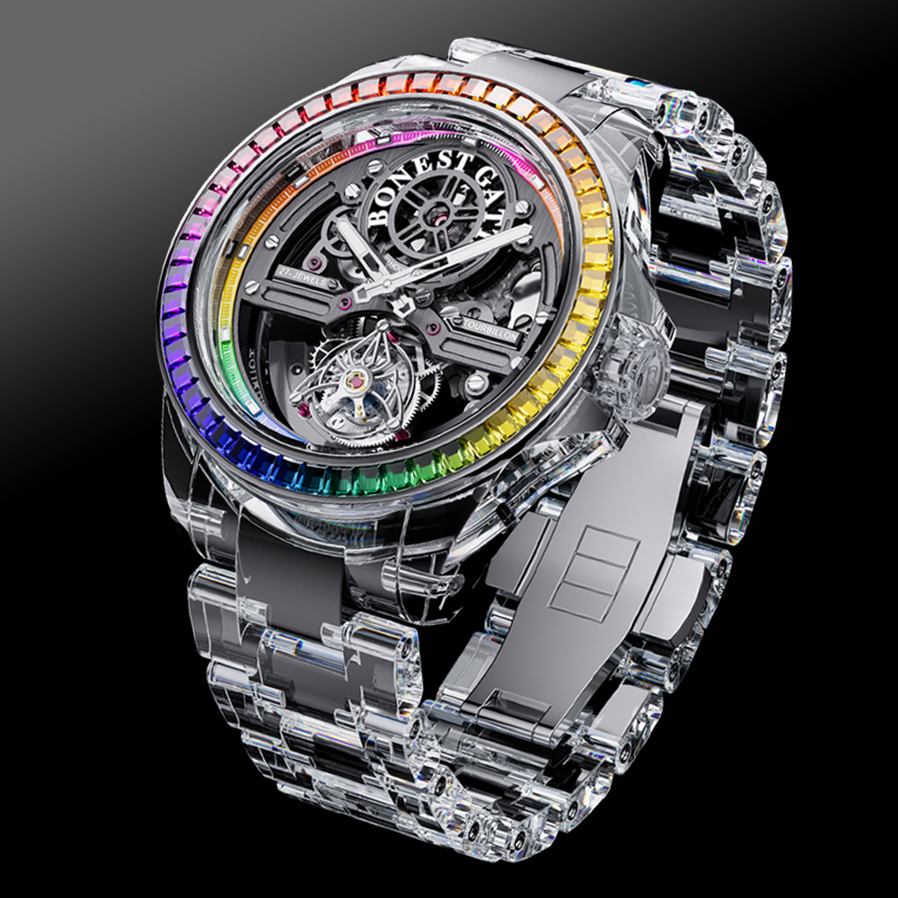 Bonest Gatti 寶加地【彩虹陀飛輪系列】以顛覆性的全透表殼設計,打破人與機械之間的界限,讓時間不再只是被讀取,而能被看見、被感受、被駕馭。透出新視界,重塑時間輪廓。大膽採用整體高強度透明水晶玻璃打造錶殼與錶帶,透徹無瑕的光澤仿若漂浮於空氣中的時光立體模型。不論是手腕翻轉之間的光線折射,或是錶面下機芯轉動的機械律動,都被水晶包覆出一種幾近超現實的感官體驗。當機械不再被隱藏,當光影成為語言,陀飛輪二代 — 運行於腕間的宇宙。