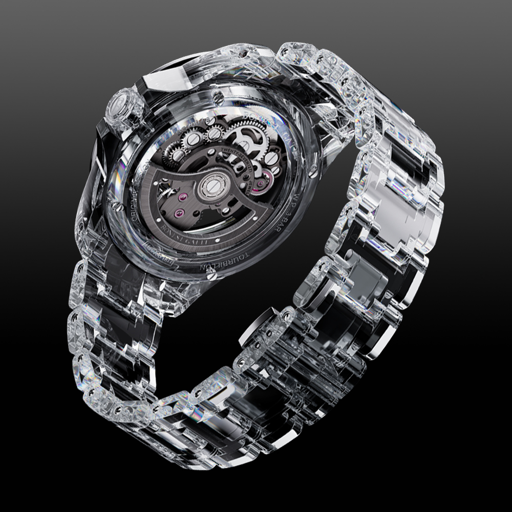 決定打破金屬包裹的傳統,大膽採用全透水晶表殼。不僅是簡單的材質替換,更是一種空間哲學的躍遷。當沉重的金屬屏障消失,人與機械的距離被縮減至零。透明鏤空設計使其像是懸浮於腕間的微型宇宙。這種毫無保留的坦誠,是寶加地對當代制錶藝術的最高定義:真正的美,無需隱藏。整隻手錶由高硬度合成藍寶石水晶玻璃精雕細琢而成,從錶殼、錶帶到錶面,360 度毫無遮掩,展現晶瑩剔透的結構美學。每一個倒角、每一道切面,都精準銳利,讓光線如鑽石般在腕間折射閃耀,彷彿將時間凍結於玻璃之中。這不僅是材質的創新,更是對完美透明的極致追求。