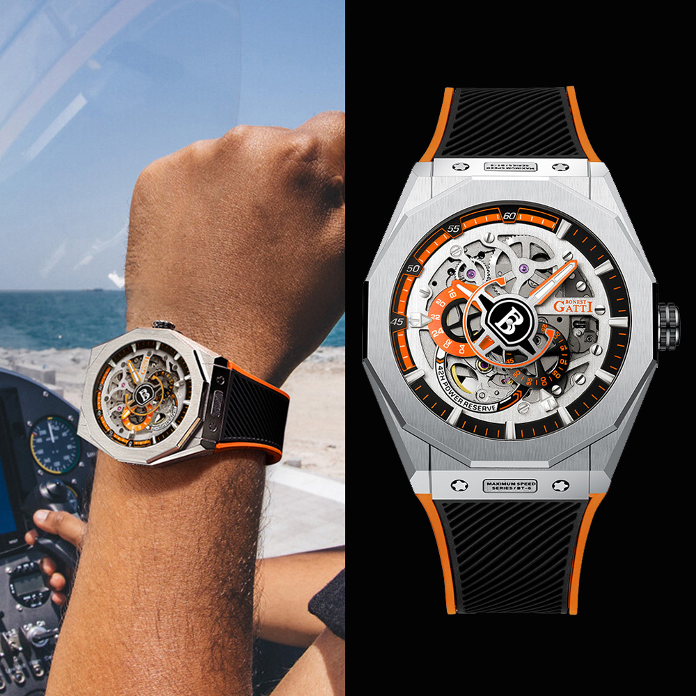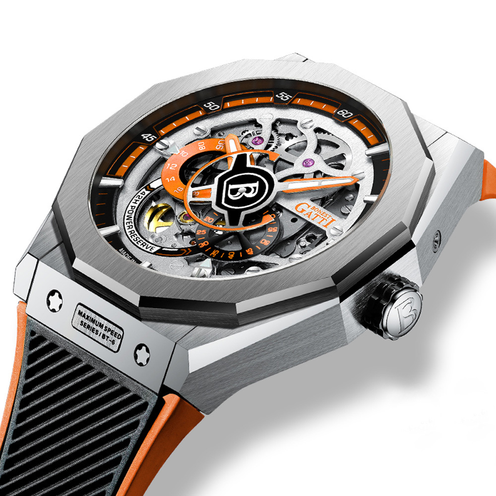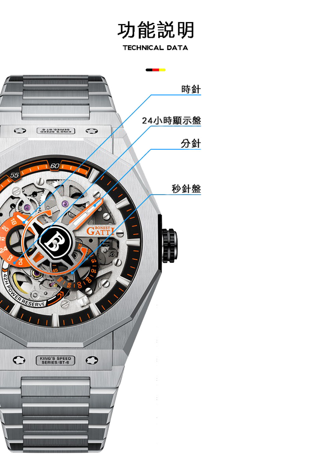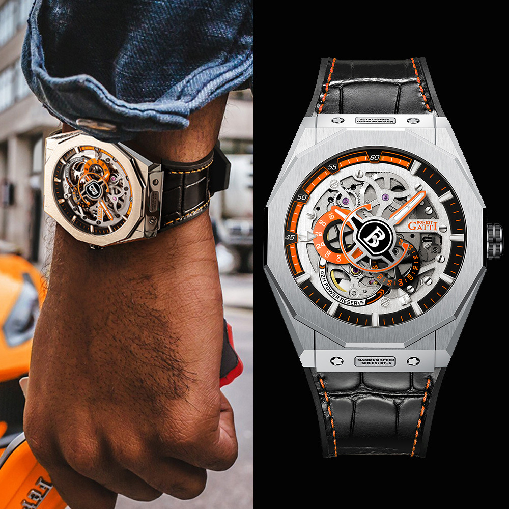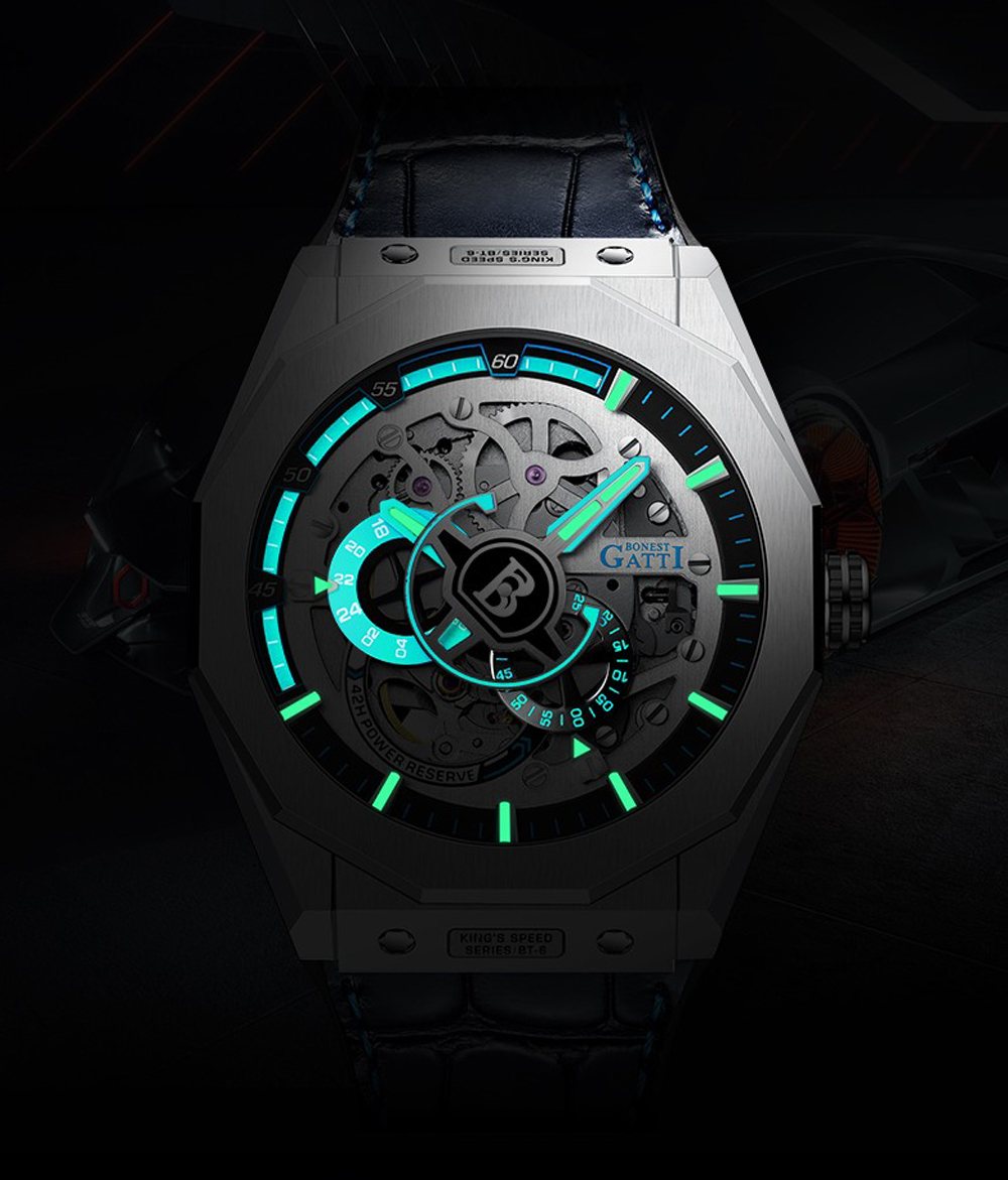 Bonest Gatti 寶加地【King Speed 競速】系列腕錶以稜角分明的錶殼線條,展現超跑奔馳時呼嘯而過的快感;與眾不同的12邊形錶圈,象徵不凡的王者姿態;全系列錶款皆以鏤空面盤呈現,靈感源自於因應賽車運動而生、堅固且輕盈的鋼管車架,並能傳遞機械運作的美感,是超跑腕錶最為畫龍點睛的靈魂所在。