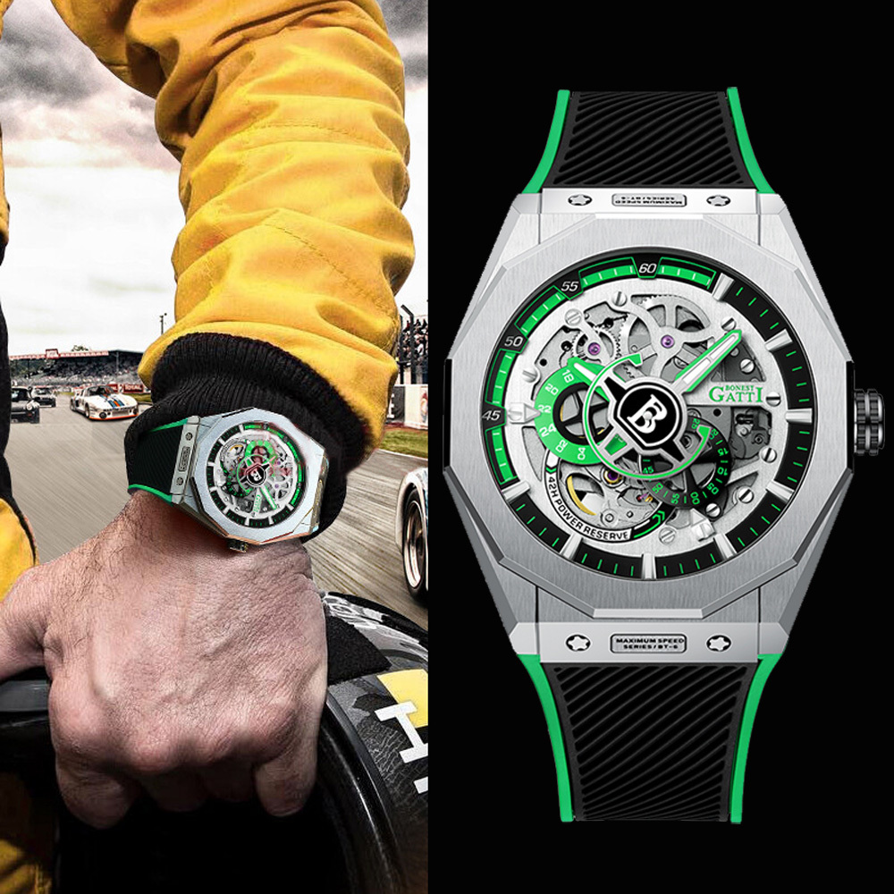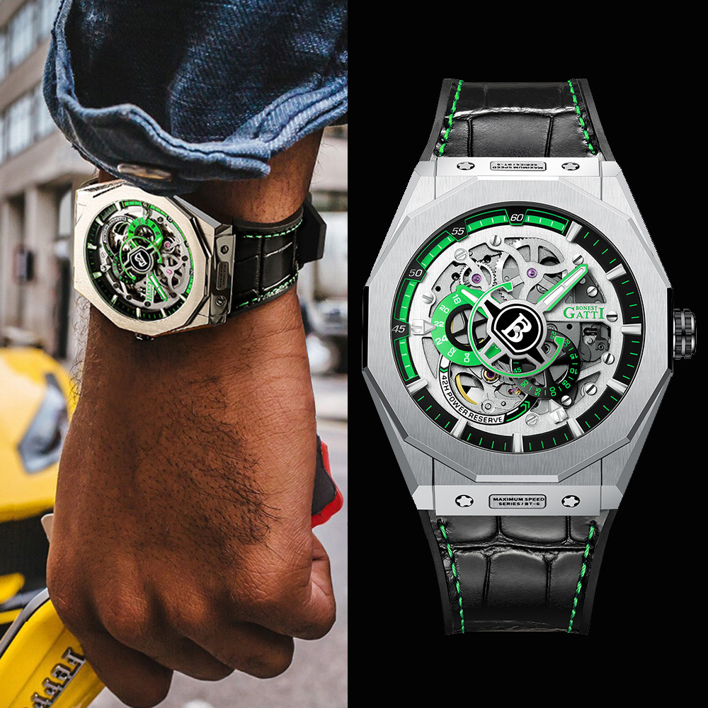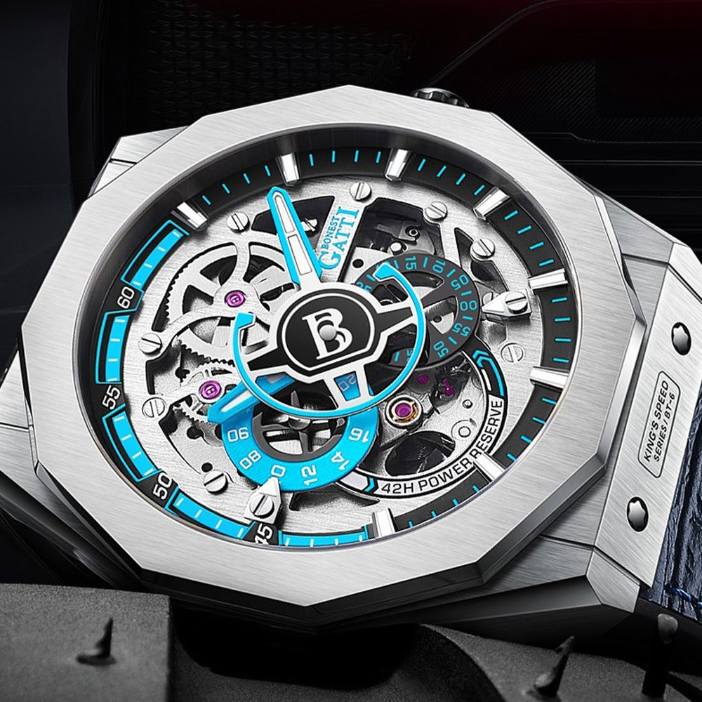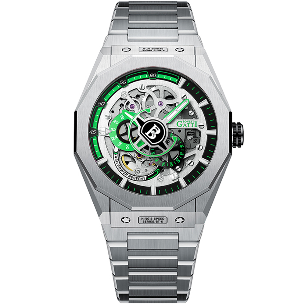 Bonest Gatti 寶加地【King Speed 競速】系列腕錶以稜角分明的錶殼線條,展現超跑奔馳時呼嘯而過的快感;與眾不同的12邊形錶圈,象徵不凡的王者姿態;全系列錶款皆以鏤空面盤呈現,靈感源自於因應賽車運動而生、堅固且輕盈的鋼管車架,並能傳遞機械運作的美感,是超跑腕錶最為畫龍點睛的靈魂所在。