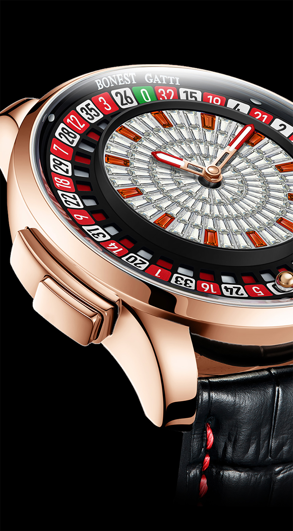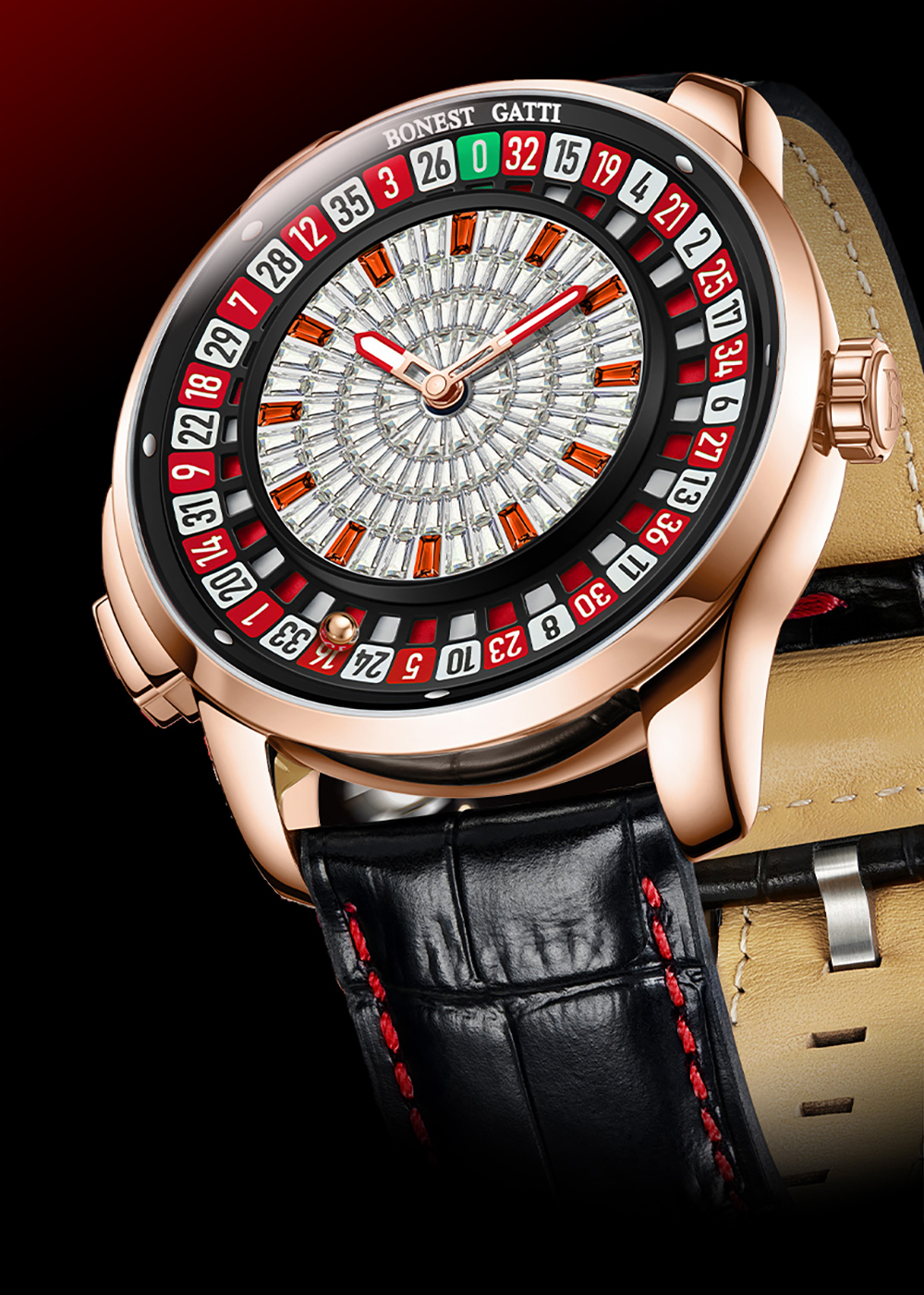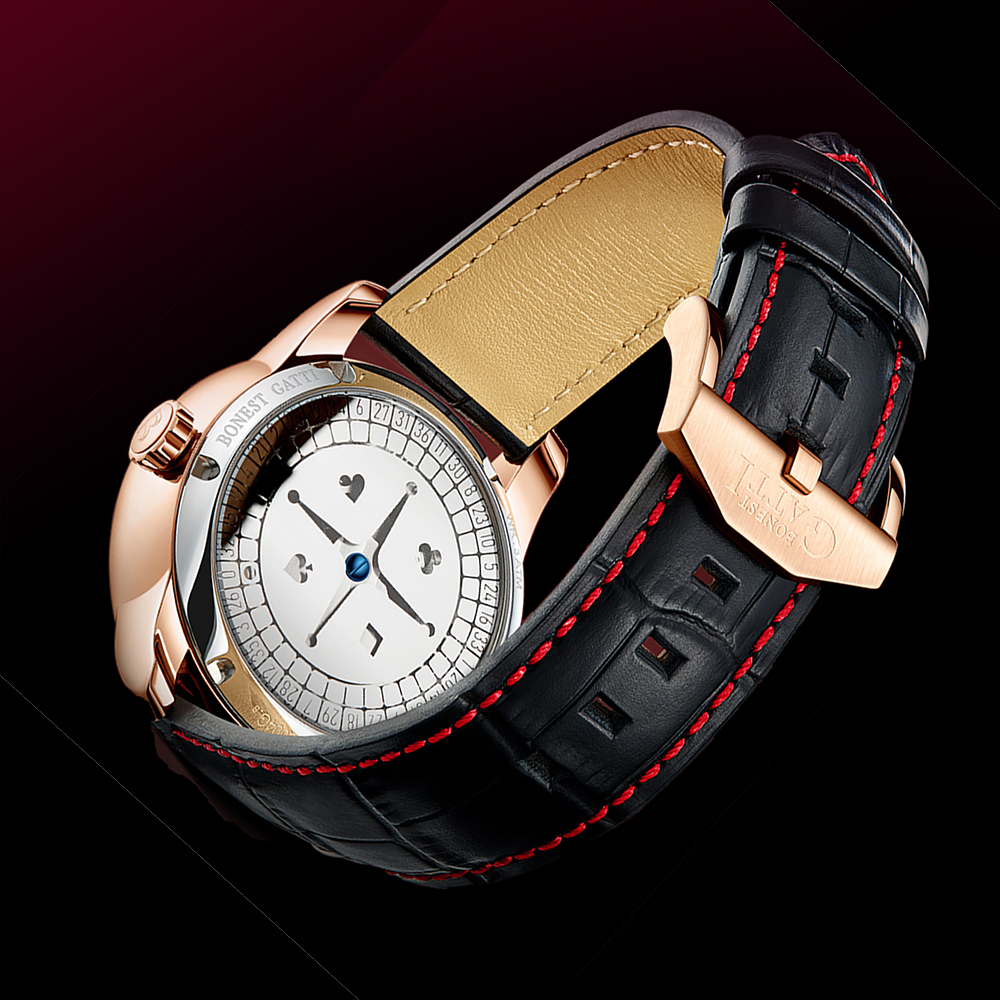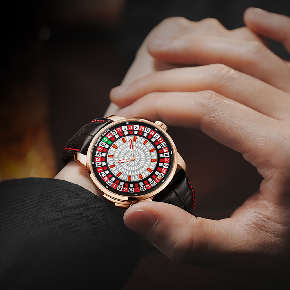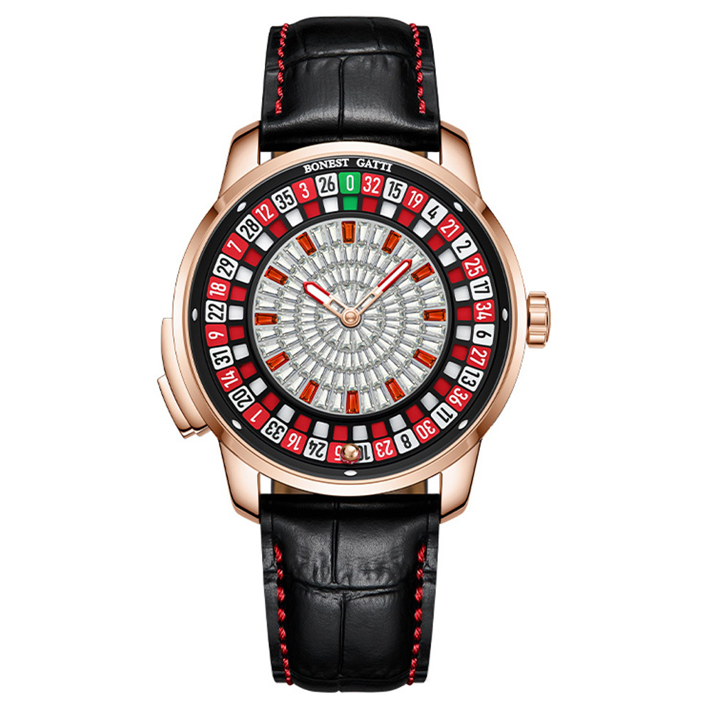 BONEST GATTI 輪盤機械錶 是一款突破傳統設計框架的時計,它將經典賭場遊戲【輪盤】,巧妙融入錶盤設計中。其最大特色便是內建的輪盤功能,只需輕按按鈕,錶盤外圈的數字盤便會如同真正的賭場輪盤般轉動,為你的生活增添一絲驚喜與趣味。