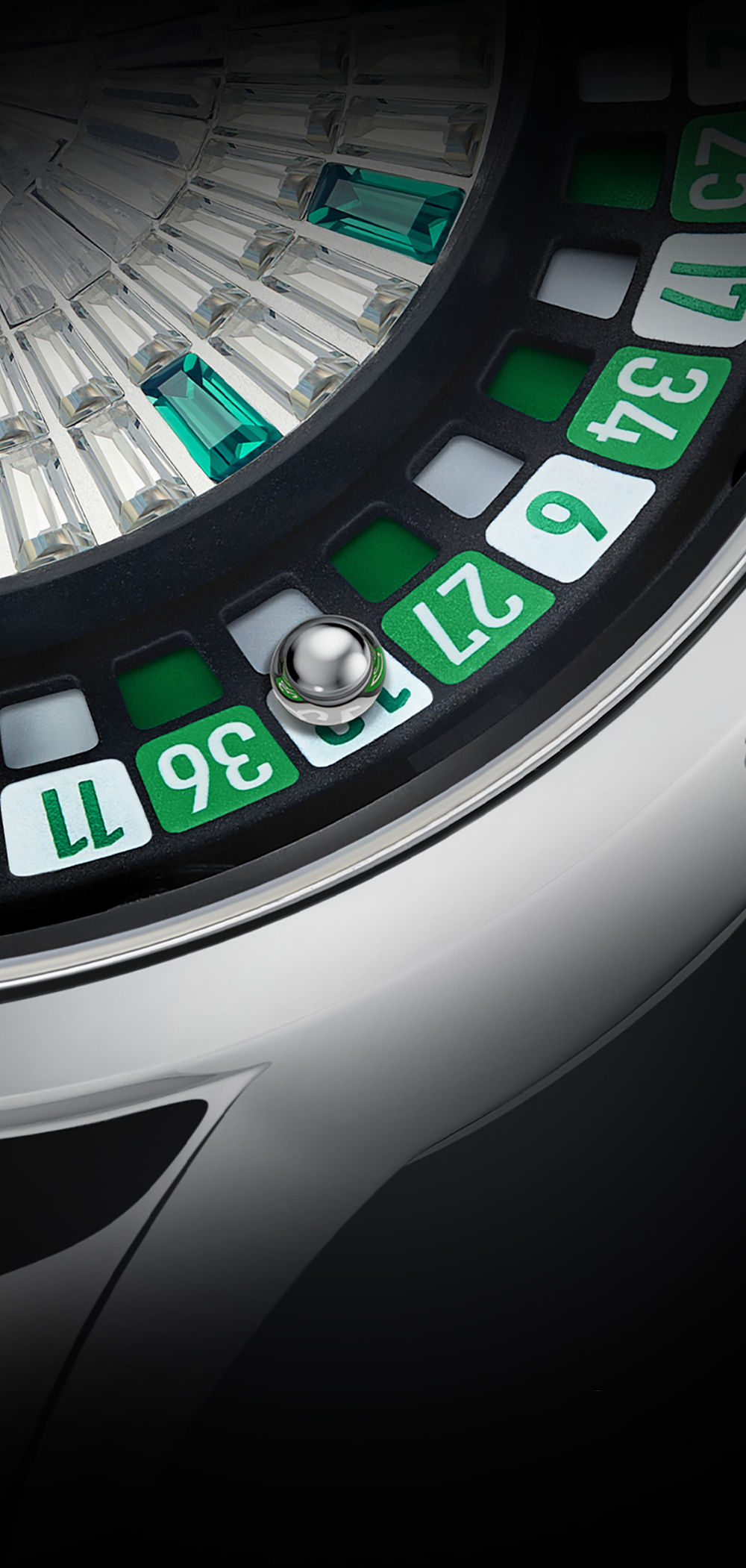 錶盤上的數字與顏色設計完全復刻賭場輪盤的元素,紅黑與綠黑的鮮明對比、綠色的「0」區塊,以及環繞外圈的數字排列,讓人一眼便能聯想到賭桌上的激動時刻。而錶盤上璀璨耀眼的方形水晶切割工藝,更是讓腕錶設計增添了一份華麗與奢華。
