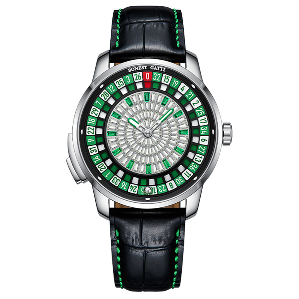 BONEST GATTI 輪盤機械錶 是一款突破傳統設計框架的時計,它將經典賭場遊戲【輪盤】,巧妙融入錶盤設計中。其最大特色便是內建的輪盤功能,只需輕按按鈕,錶盤外圈的數字盤便會如同真正的賭場輪盤般轉動,為你的生活增添一絲驚喜與趣味。