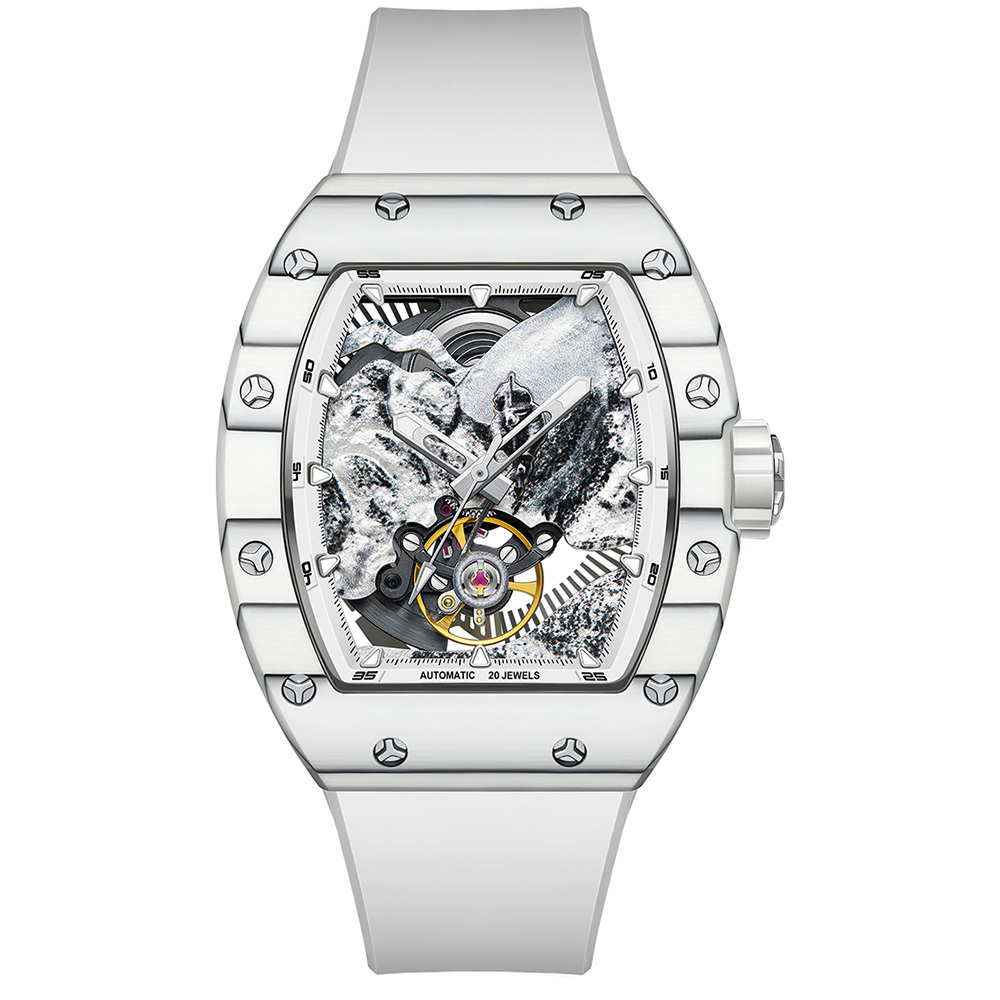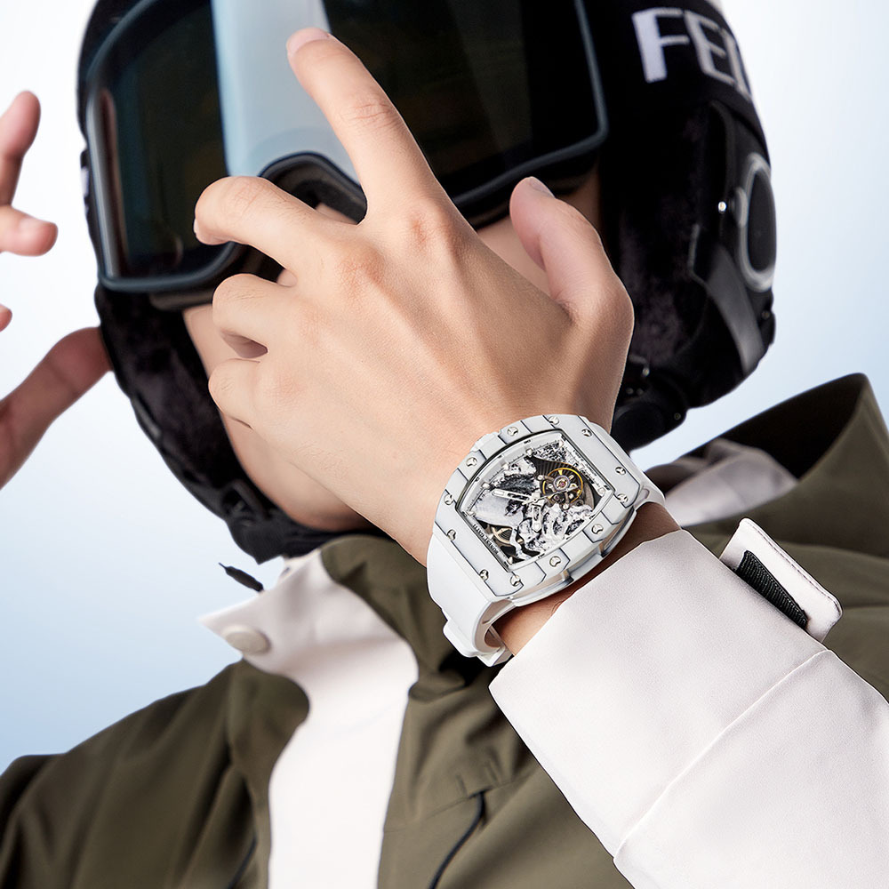 冰川超凡脫俗的壯麗,就如同透明的城堡佇立於浩瀚的大自然中,常常令人驚嘆嚮往! 為呼應世人對全球溫室效應氣候暖化的重視,《寶加地》特別推出以皓雪冰川為設計元素的《賽博魅影 - 冰川款》。灰白相間的鏤空面盤,搭配滴答不息的擺輪系統,象徵著綿延天邊的壯麗景緻! 錶背底蓋則以白色線條勾勒出攀岩者的樣貌,藉此向無畏無懼的極地冒險家們致敬!