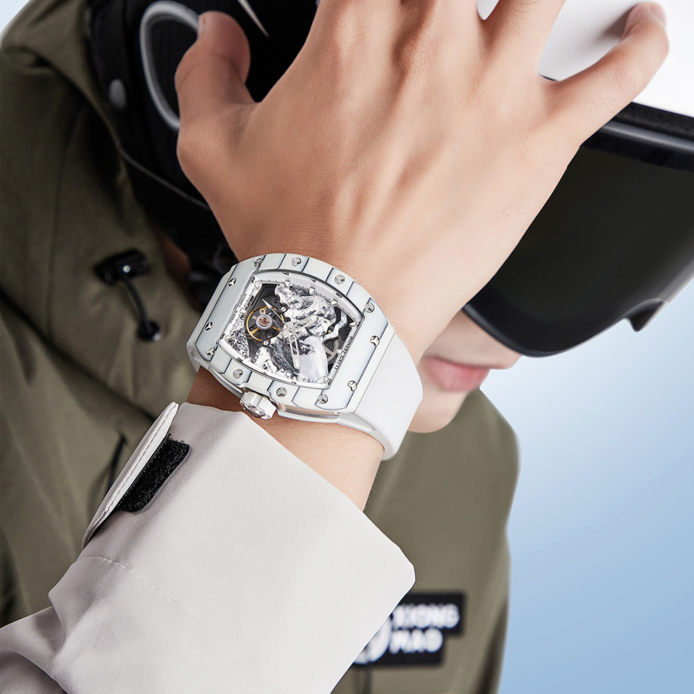 【賽博魅影】設計上以輕量化設計為主要訴求,全錶採用高科技碳纖維結合羽量級鋁合金錶殼打造而成,氟化橡膠錶帶輕盈服貼的特性,猶如超跑競技中向來追求輕量化與多樣性的卓越表現。