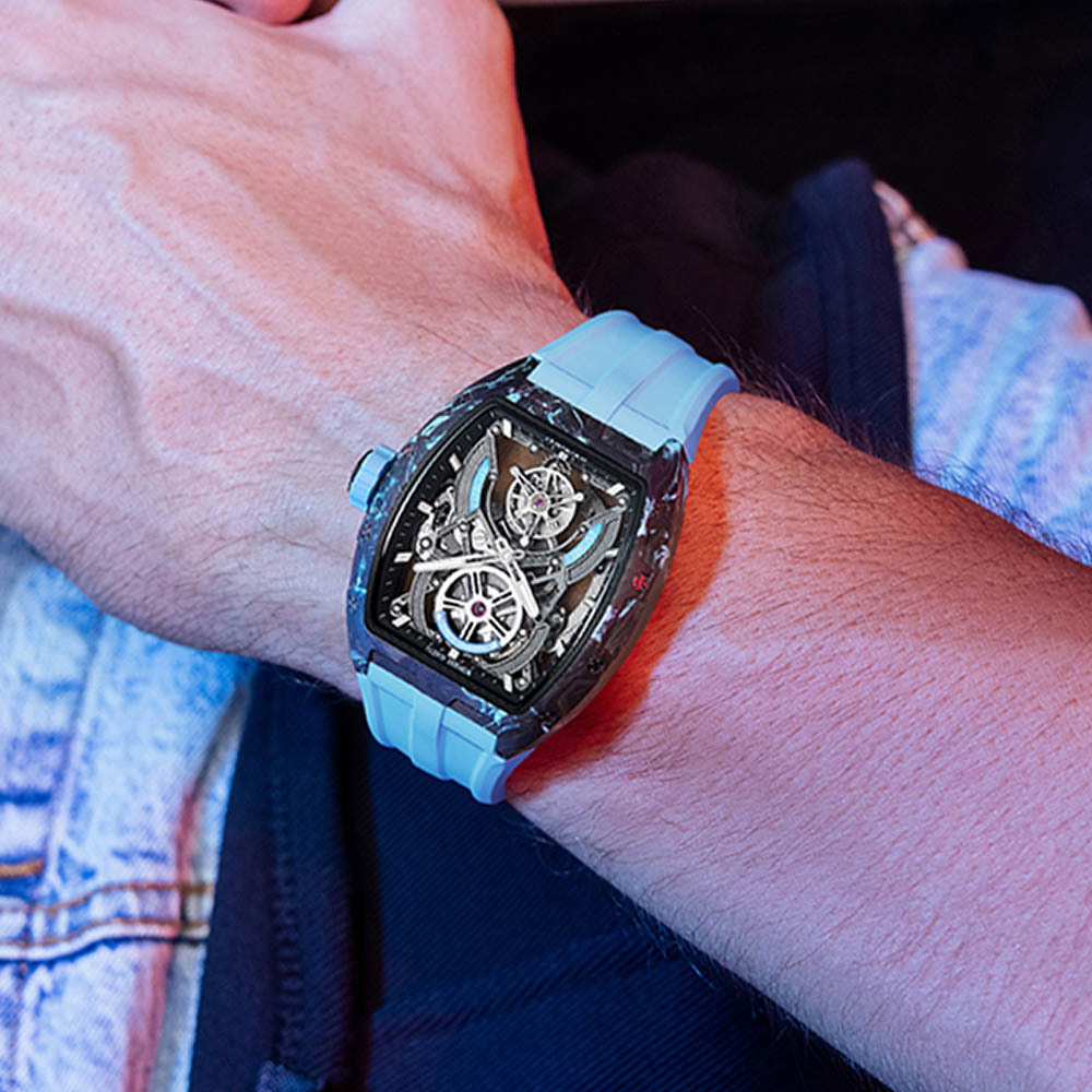 Bonest Gatti 寶加地【陀飛輪魅影系列】以高科技藍黑混色酒桶形碳纖維表殼為載體,搭載自動上鏈陀飛輪機芯,將速度與機械工藝融為一體,為您呈現一場時間美學的視覺盛宴。航太級的碳纖維材質打造的酒桶形錶殼,兼具輕量化與高強度特性。獨特的藍黑漸變色澤,讓每一枚腕錶都擁有獨一無二的紋理。錶殼曲線經過人體工學設計,完美貼合手腕,提供絕佳的佩戴體驗。