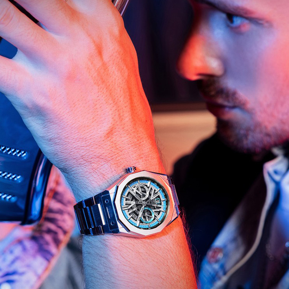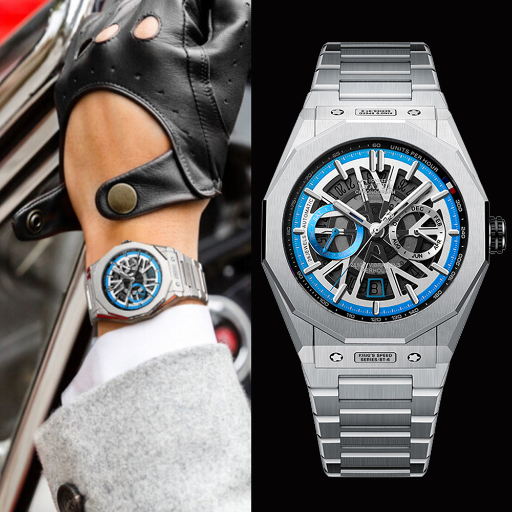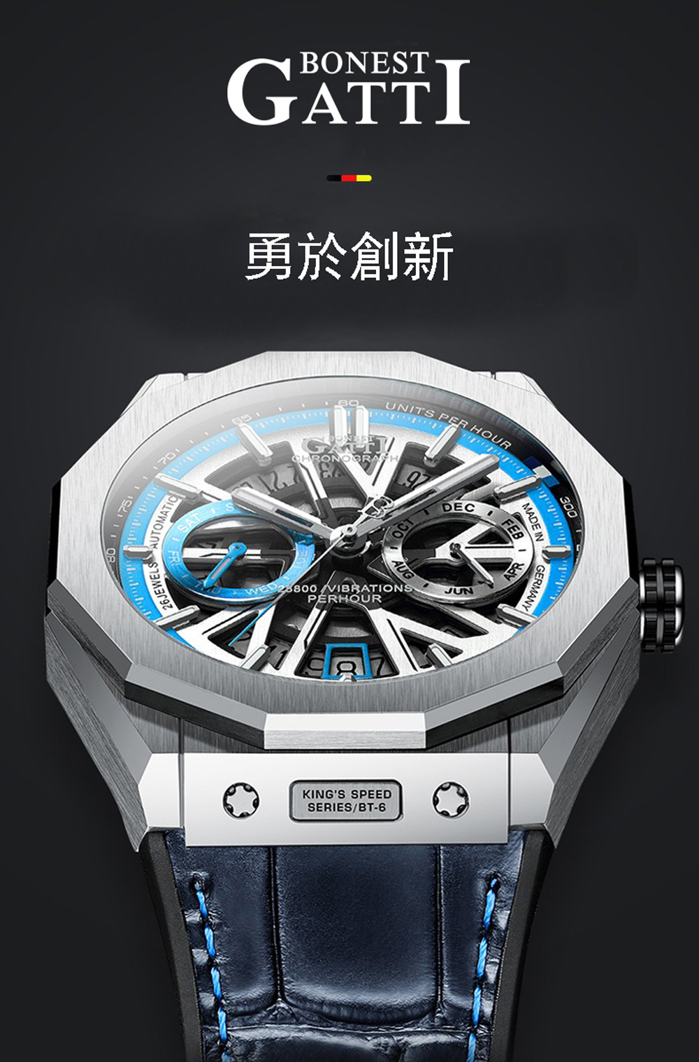 Bonest Gatti 寶加地【King Speed 競速】系列腕錶以稜角分明的錶殼線條,展現超跑奔馳時呼嘯而過的快感;與眾不同的12邊形錶圈,象徵不凡的王者姿態;全系列錶款皆以鏤空面盤呈現,靈感源自於因應賽車運動而生、堅固且輕盈的鋼管車架,並能傳遞機械運作的美感,是超跑腕錶最為畫龍點睛的靈魂所在。