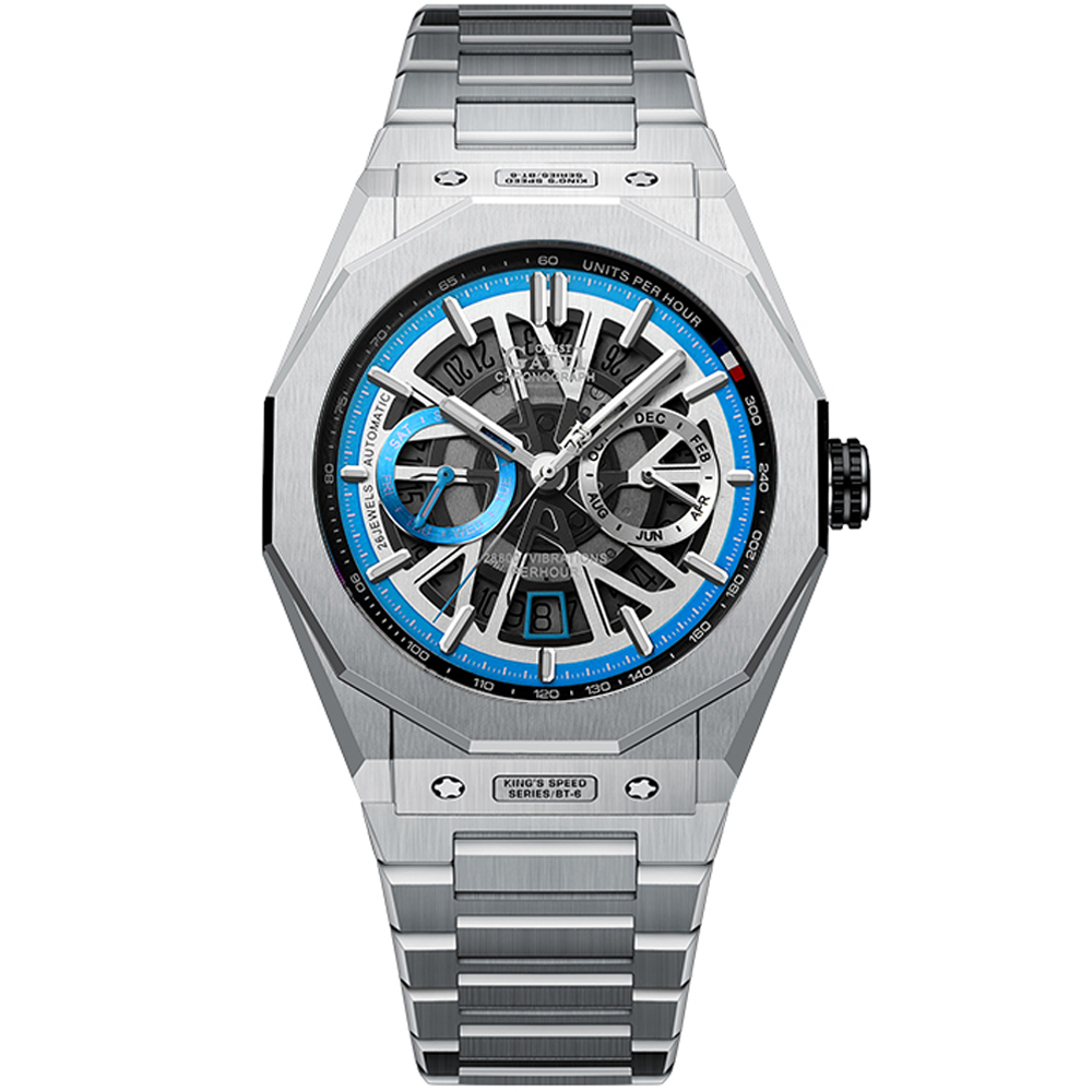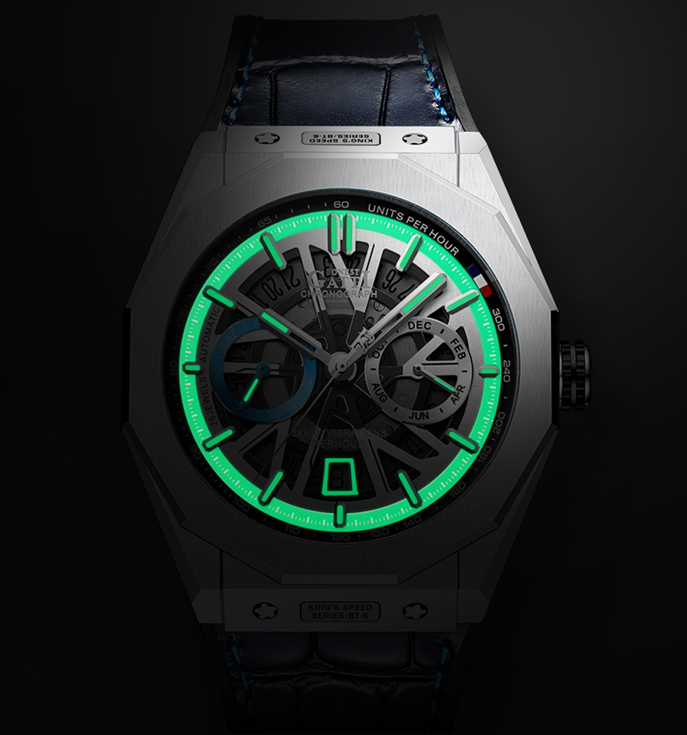 【King Speed 競速】系列腕錶以稜角分明的錶殼線條,展現超跑奔馳時呼嘯而過的快感;與眾不同的12邊形錶圈,象徵不凡的王者姿態;全系列錶款皆以鏤空面盤呈現,靈感源自於因應賽車運動而生、堅固且輕盈的鋼管車架,並能傳遞機械運作的美感,是超跑腕錶最為畫龍點睛的靈魂所在。