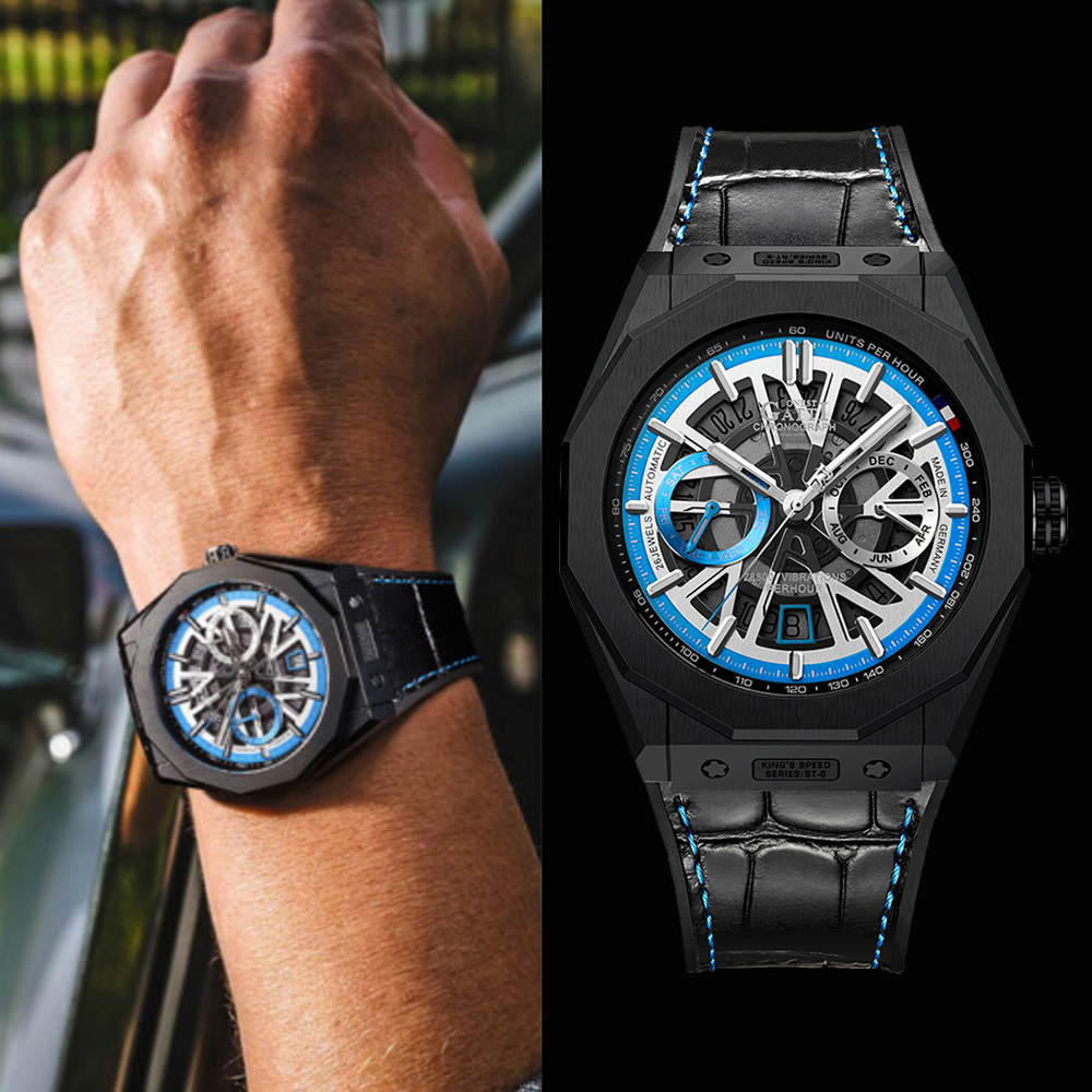 【King Speed 競速】系列腕錶以稜角分明的錶殼線條,展現超跑奔馳時呼嘯而過的快感;與眾不同的12邊形錶圈,象徵不凡的王者姿態;全系列錶款皆以鏤空面盤呈現,靈感源自於因應賽車運動而生、堅固且輕盈的鋼管車架,並能傳遞機械運作的美感,是超跑腕錶最為畫龍點睛的靈魂所在。