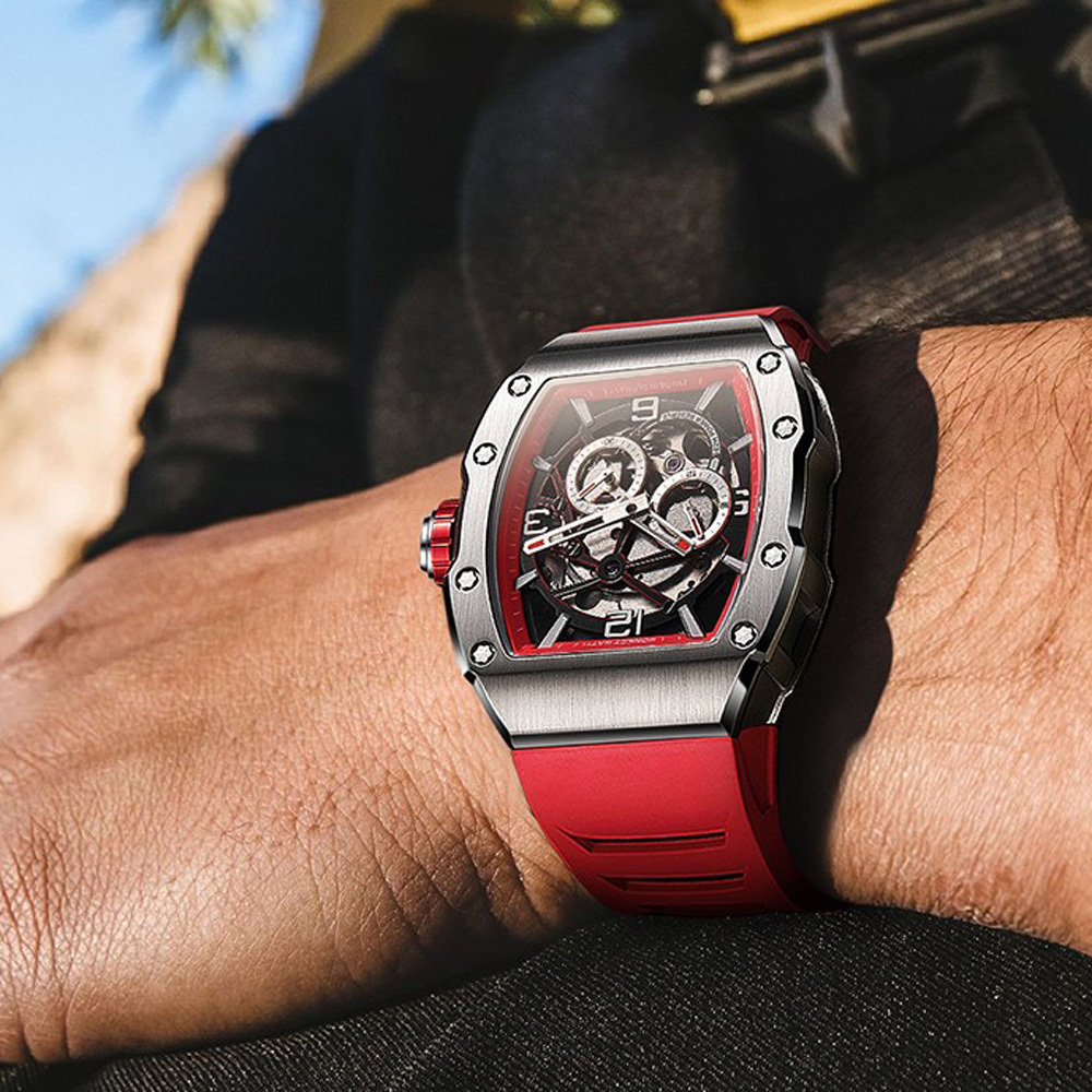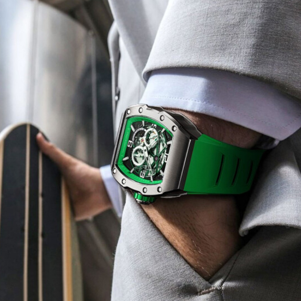 有別於絕大多數運動錶的圓形外觀,BONEST GATTI 為【魅影】系列賦予相對小眾的酒桶形錶殼,增加與眾不同的識別度。BONEST GATTI 以新潮立體大膽的風格,來打造【魅影】系列的酒桶形外觀,其中最吸睛的莫過於錶殼兩側垂直的勾槽紋路,取材超跑的流線工藝,而氟化橡膠錶帶輕盈服貼的特性,更是展現超跑向來追求輕量化與高速貼背感的舒適性。