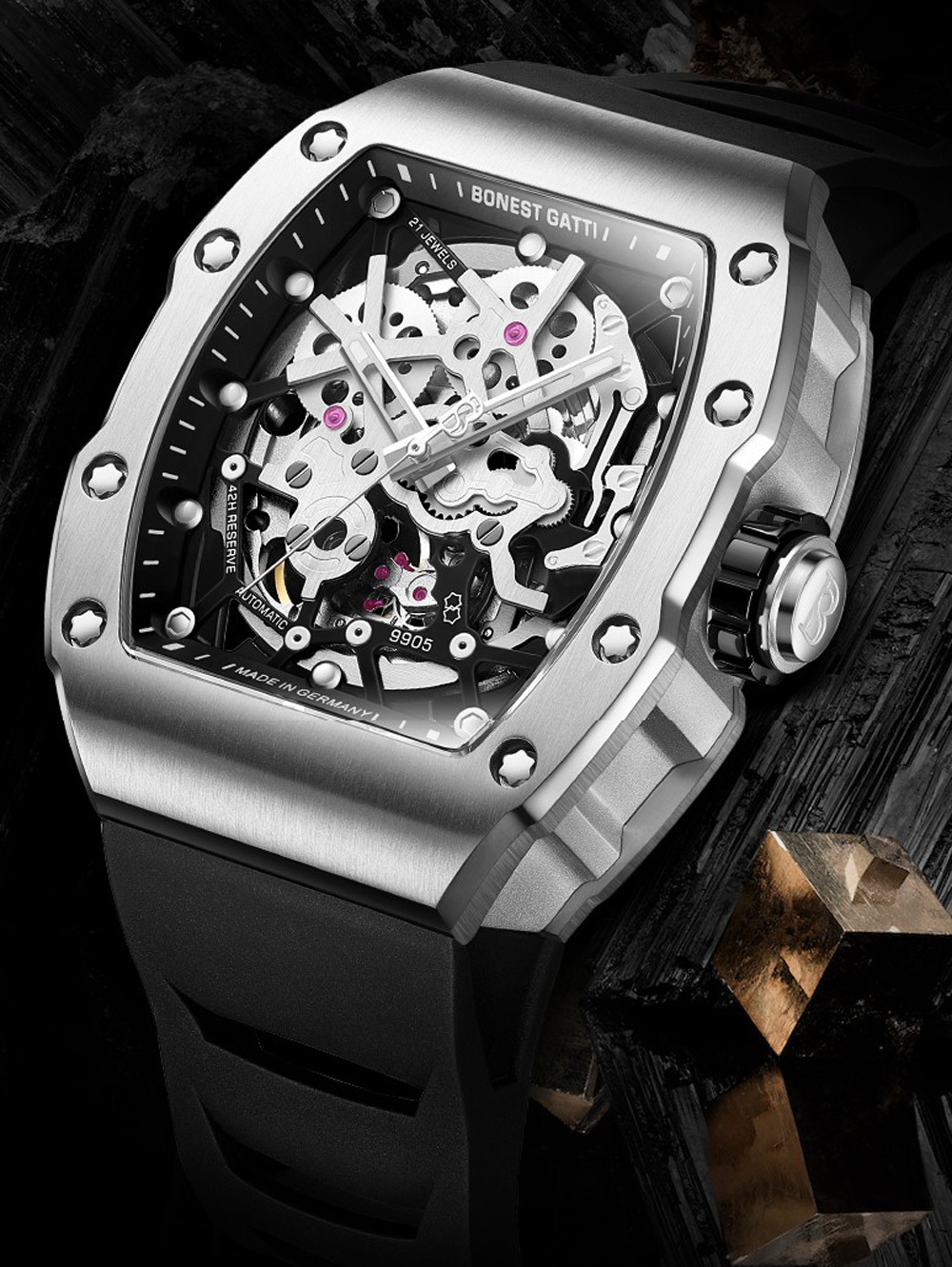 有別於絕大多數運動錶的圓形外觀,BONEST GATTI 為【魅影】系列賦予相對小眾的酒桶形錶殼,增加與眾不同的識別度。BONEST GATTI 以新潮立體大膽的風格,來打造【魅影】系列的酒桶形外觀,其中最吸睛的莫過於錶殼兩側垂直的勾槽紋路,取材超跑的流線工藝,而氟化橡膠錶帶輕盈服貼的特性,更是展現超跑向來追求輕量化與高速貼背感的舒適性。
