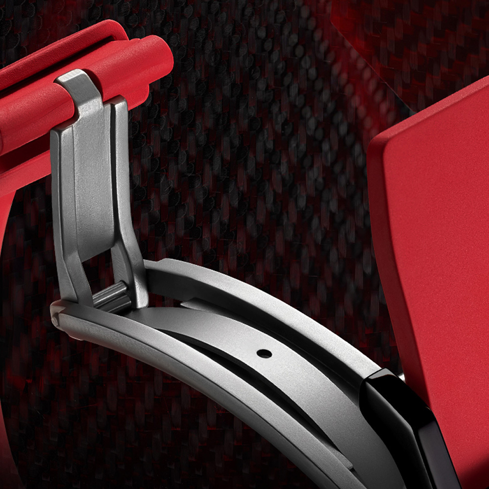 橡膠錶帶搭配品牌特別設計的蝴蝶彈簧扣,不僅配戴更為舒適方便,開關時俐落的回饋手感,就像F1賽車上的換檔撥片般輕脆,絕對是賽車腕錶最佳的體驗。
