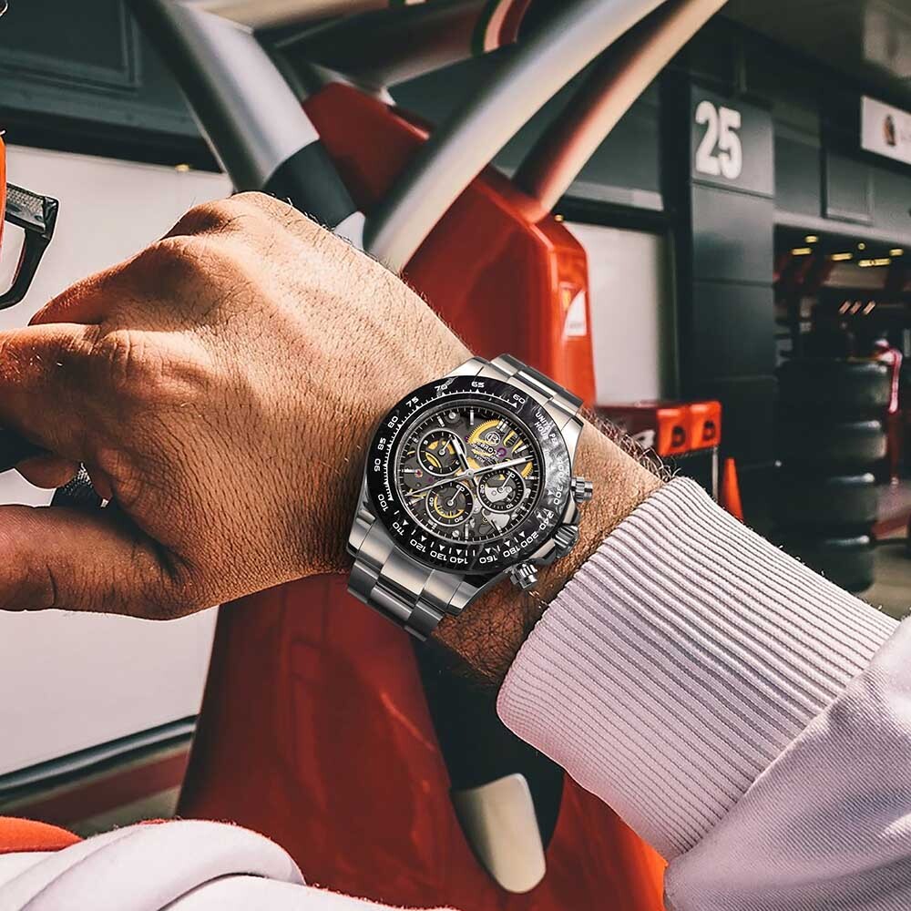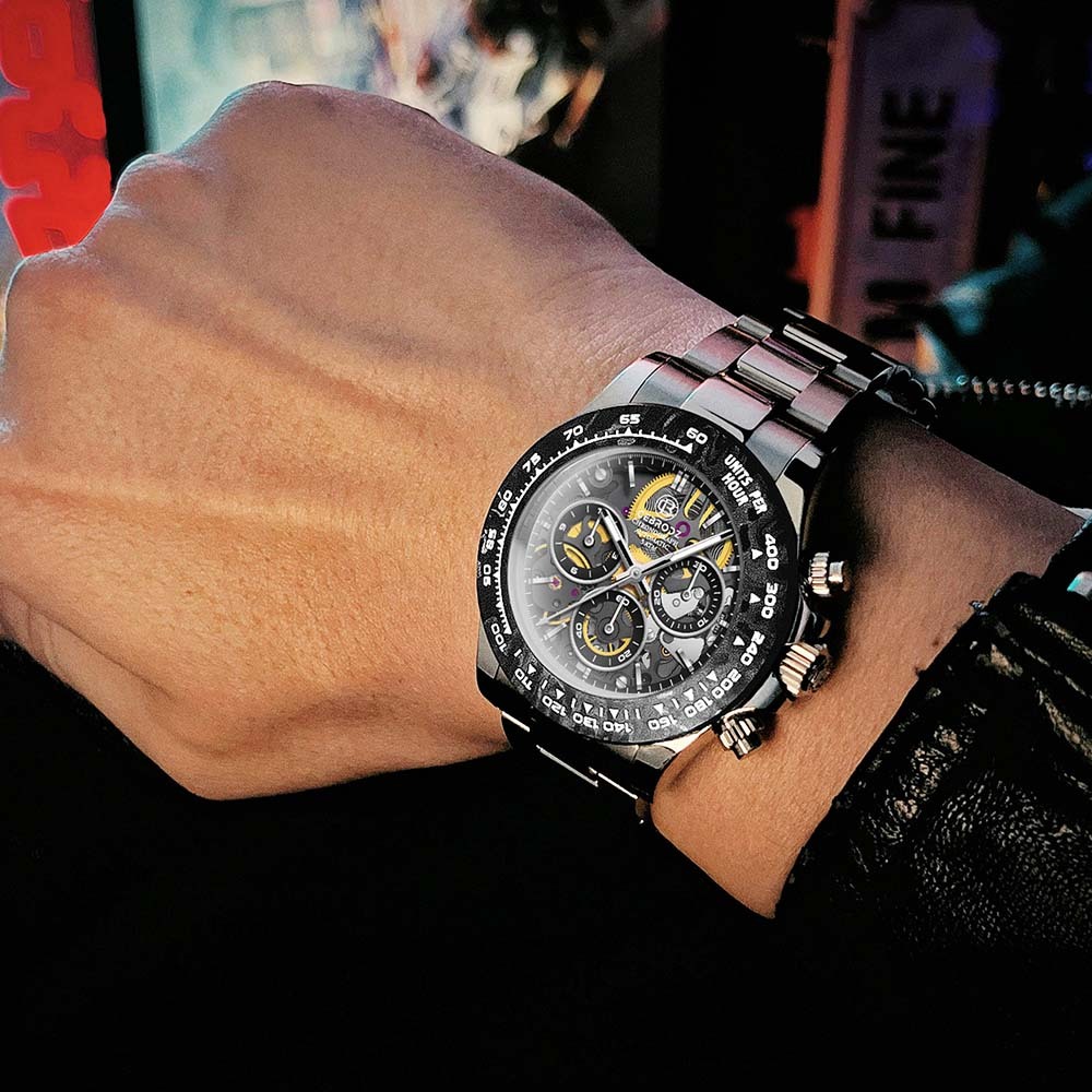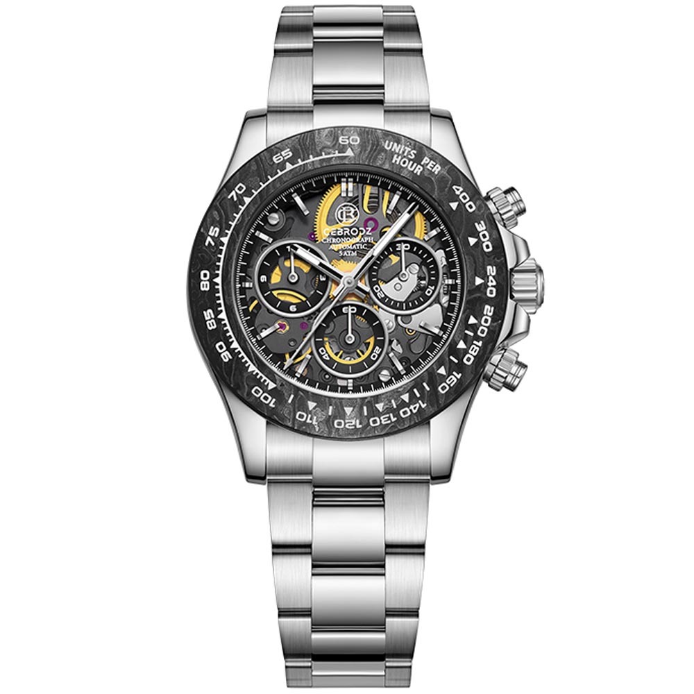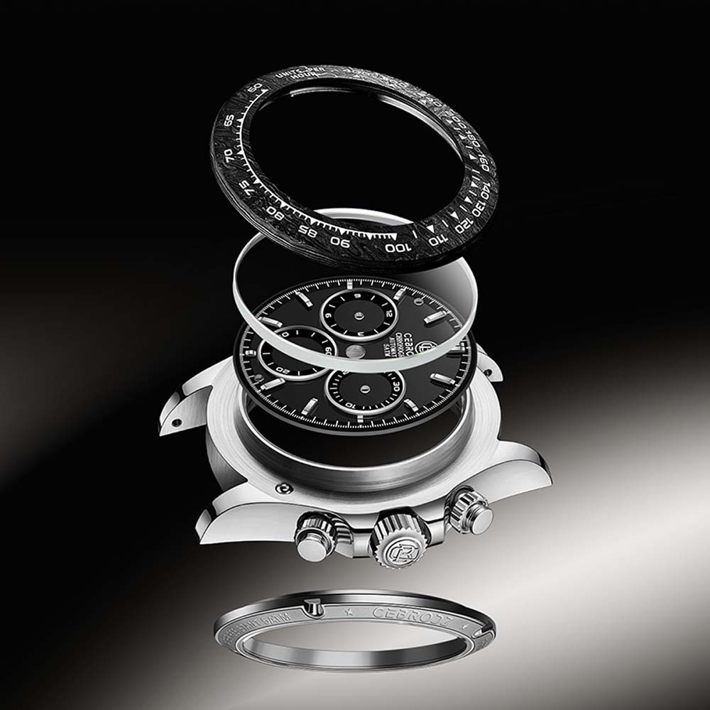 Cebrodz【銀匠系列】碳纖款採用904等級不鏽鋼打造,堅實結構中蘊藏細膩工藝,正面採鏤空錶盤設計,並搭載導柱輪結構的自動上鍊計時碼錶機芯;外框搭配可換式黑色碳纖維計時錶圈,輕量、高強度,同時展現出運動與科技的精準美感。碳纖維的紋理在光影下閃耀,為整體設計注入剛柔並濟的現代靈魂。