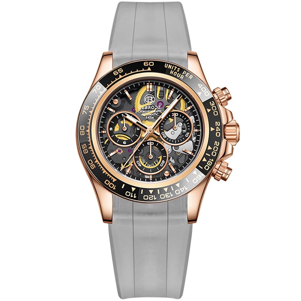 Cebrodz【金匠系列】以玫瑰金鏤空設計展現機械之美,搭載自動上鍊計時碼錶機芯,採用904等級不鏽鋼錶殼,結合PVD級電鍍工藝。外層配備可更換式黑金色陶瓷計時圈,不僅輕盈堅固更彰顯運動與奢華。