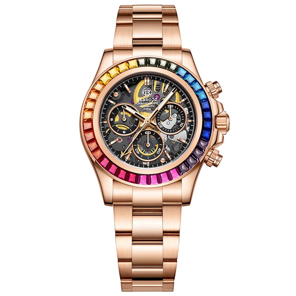 Cebrodz【金匠系列】彩鑽款以玫瑰金鏤空設計演繹機械藝術的腕錶,搭載自動上鍊計時碼錶機芯,精準與美感兼具。錶殼採用904等級不鏽鋼製成,結合PVD電鍍工藝,展現持久耀眼的金屬光澤。彩鑽款外框鑲嵌可更換式彩虹鑽錶圈,從紅至紫的漸層光芒,象徵無限可能與個性態度,無論白晝或夜晚,都能綻放獨一無二的魅力,彷彿將時間化為一場絢麗盛宴。