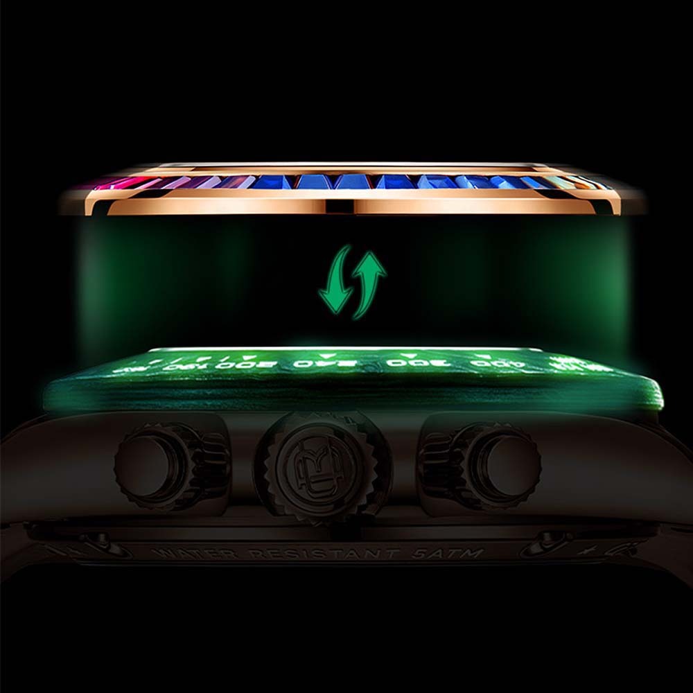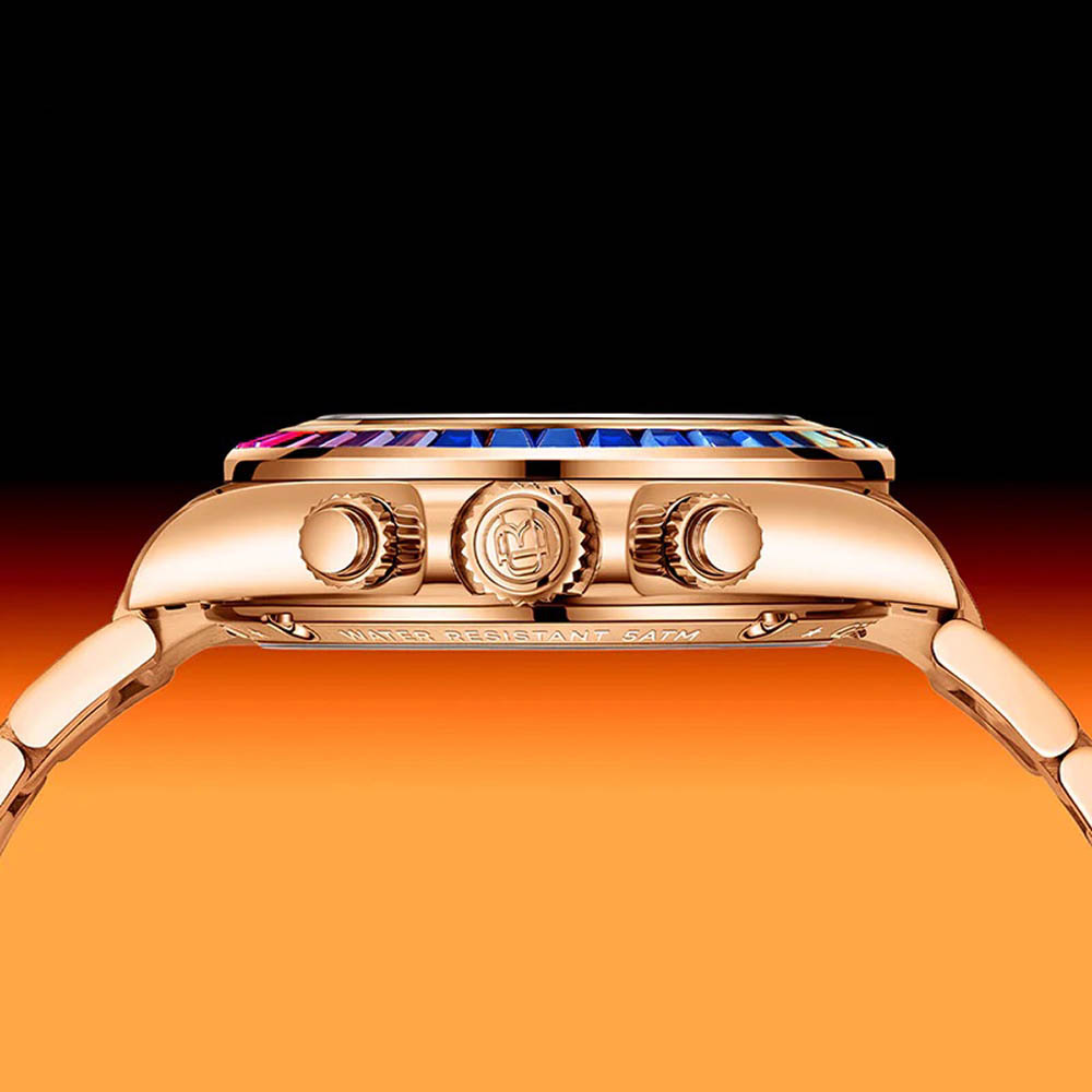 【金匠彩鑽款】以玫瑰金鏤空設計演繹機械藝術的腕錶,搭載自動上鍊計時碼錶機芯,精準與美感兼具。錶殼採用904等級不鏽鋼製成,結合PVD電鍍工藝,展現持久耀眼的金屬光澤。彩鑽款外框鑲嵌可更換式彩虹鑽錶圈,從紅至紫的漸層光芒,象徵無限可能與個性態度,無論白晝或夜晚,都能綻放獨一無二的魅力,彷彿將時間化為一場絢麗盛宴。