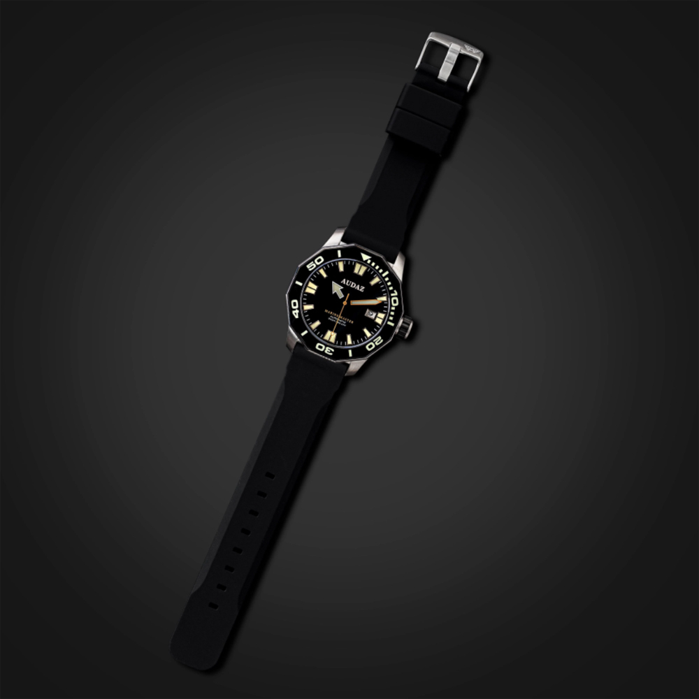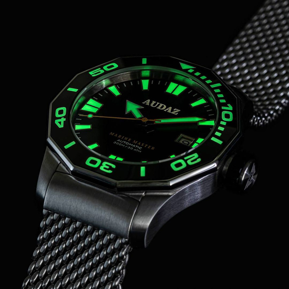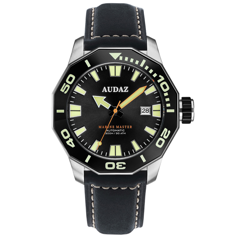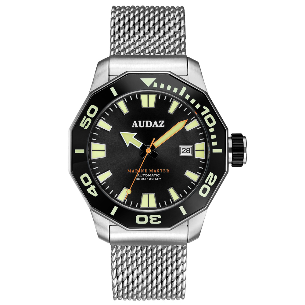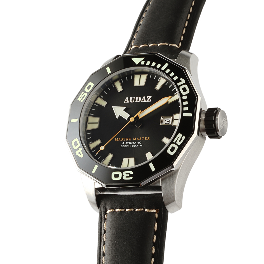 AUDAZ【Marine Master-遠洋大師】300米潛水錶,最大特色在於潛水錶的12邊形錶圈設計,以少見的多邊形元素,賦予潛水錶與眾不同的簡約風範。其二是12邊形與潛水時慣用的5分鐘單位刻度完美契合,方便對齊刻度指標。少了刻紋與凹槽,Marine Master潛水錶的錶圈邊緣便能夠以光滑的亮面呈現,與髮絲紋處理的緞面不鏽鋼錶殼形成對比,增加視覺上的層次感。