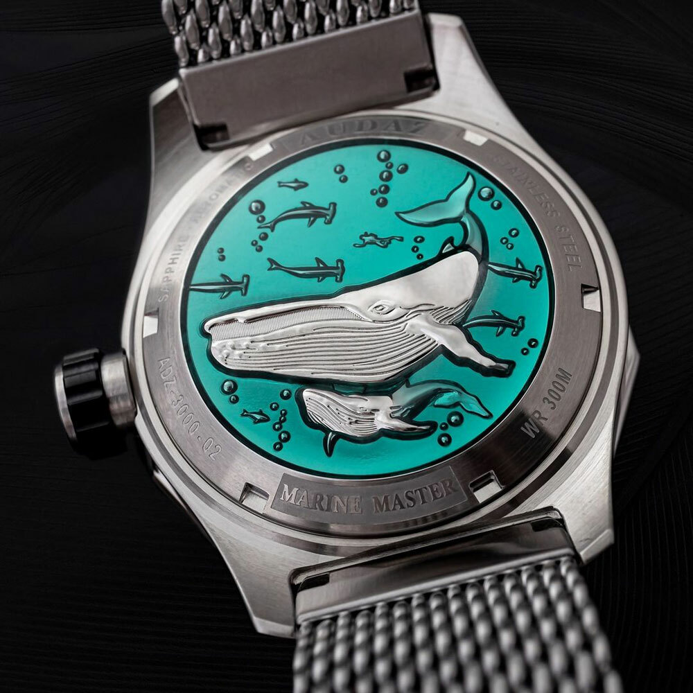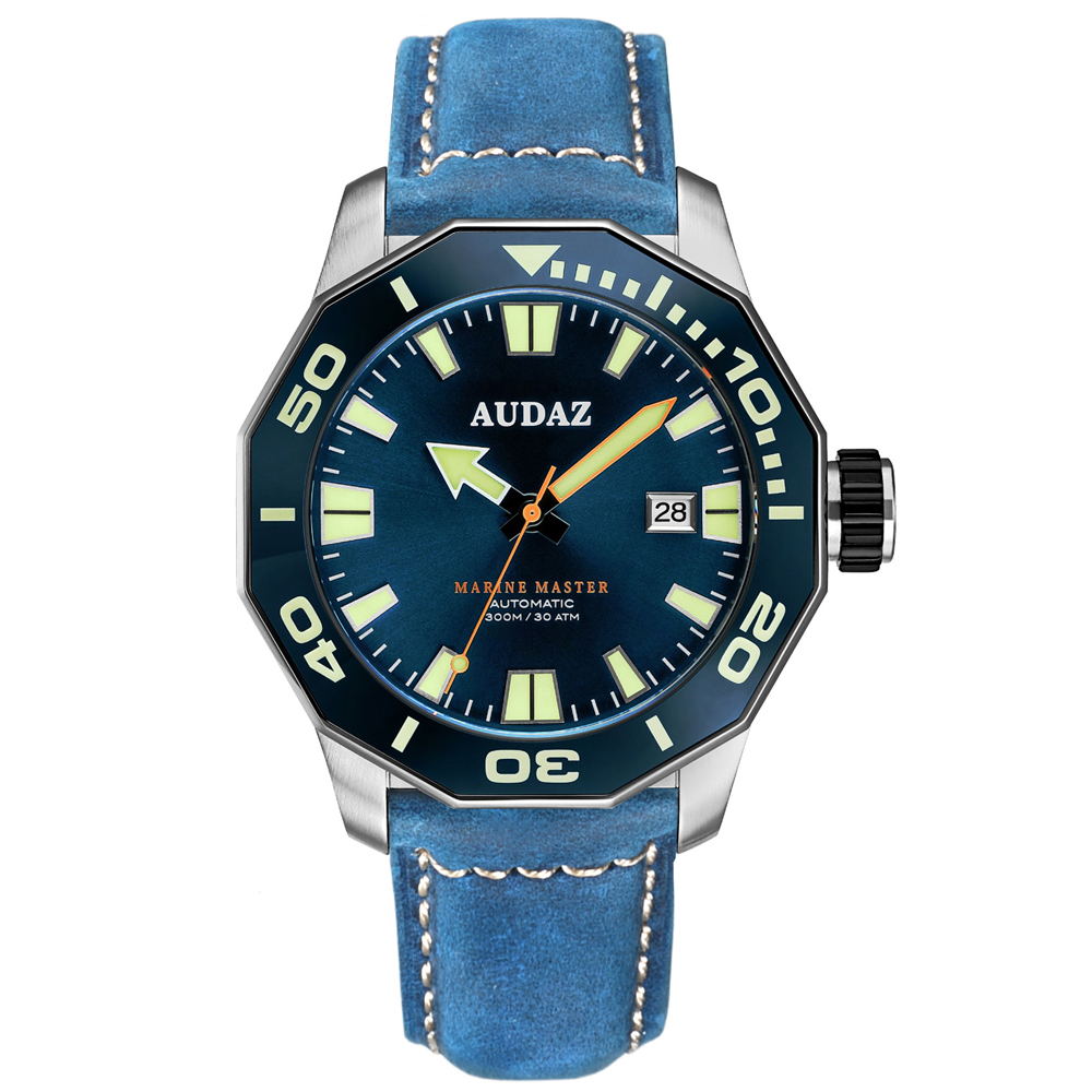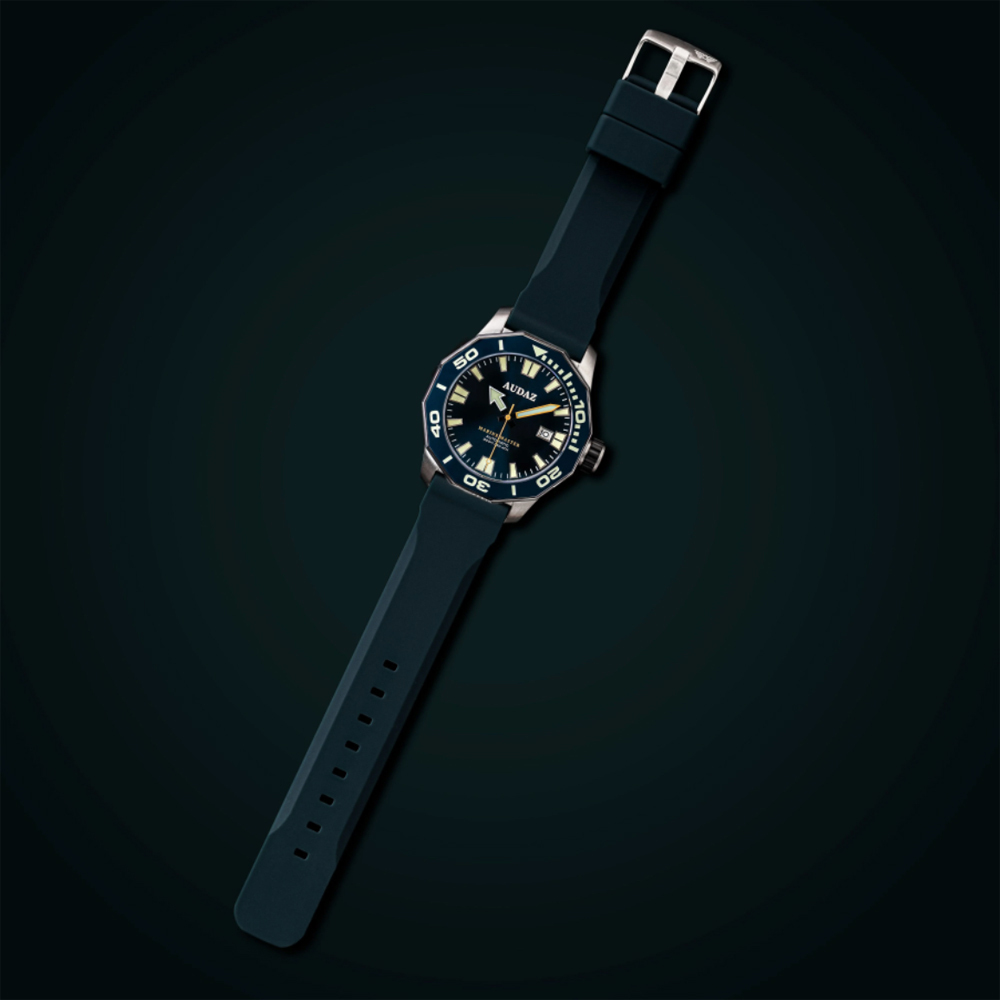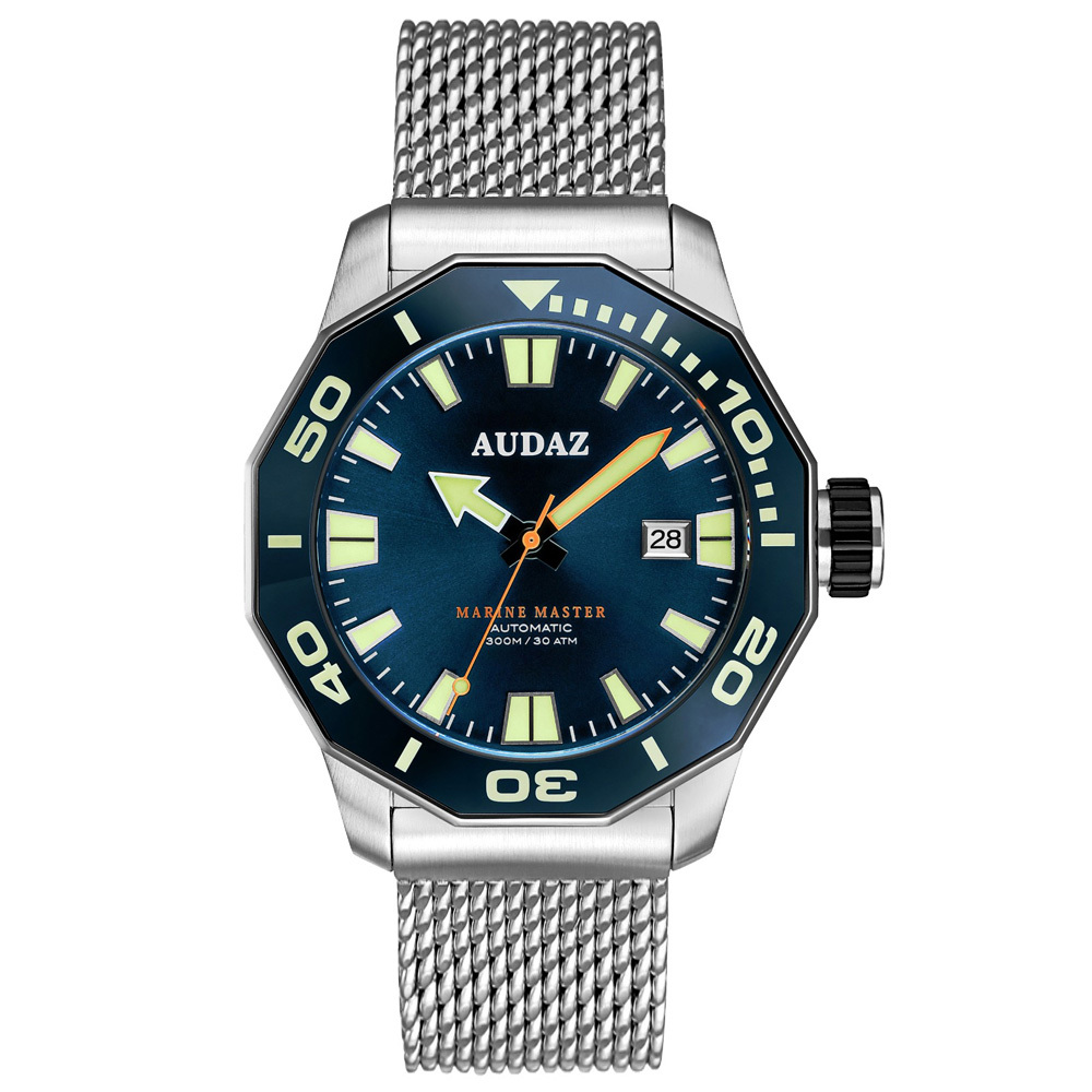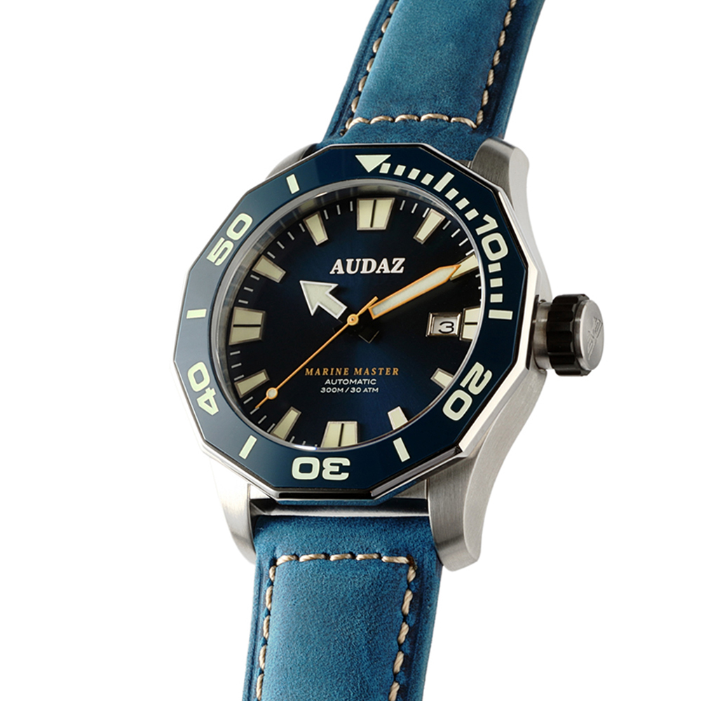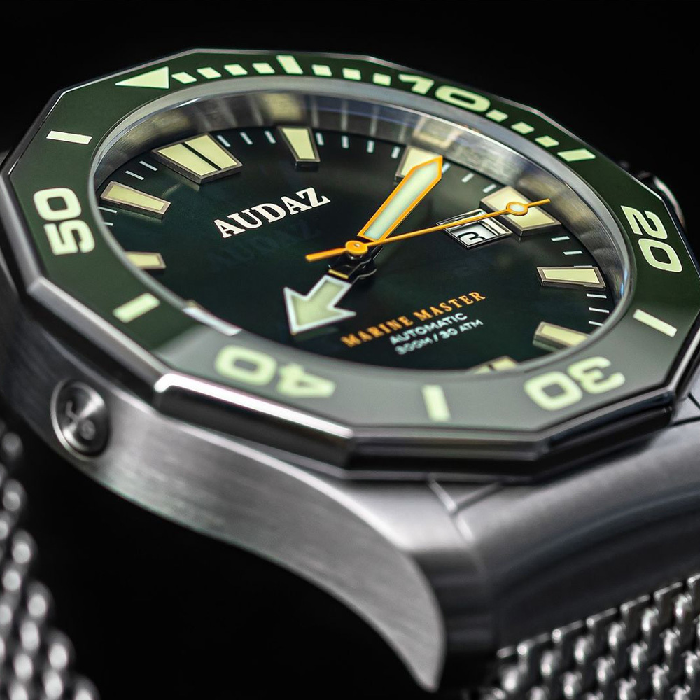 AUDAZ【Marine Master-遠洋大師】300米潛水錶,最大特色在於潛水錶的12邊形錶圈設計,以少見的多邊形元素,賦予潛水錶與眾不同的簡約風範。其二是12邊形與潛水時慣用的5分鐘單位刻度完美契合,方便對齊刻度指標。少了刻紋與凹槽,Marine Master潛水錶的錶圈邊緣便能夠以光滑的亮面呈現,與髮絲紋處理的緞面不鏽鋼錶殼形成對比,增加視覺上的層次感。