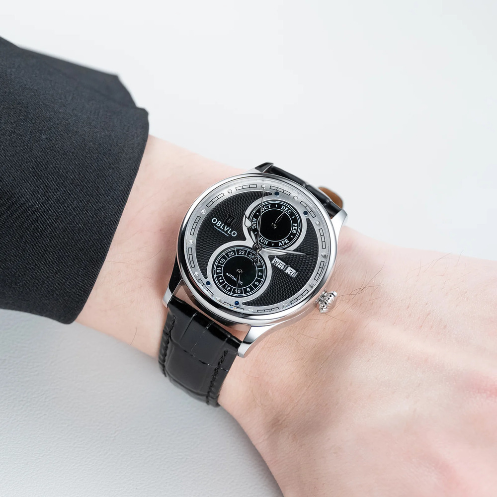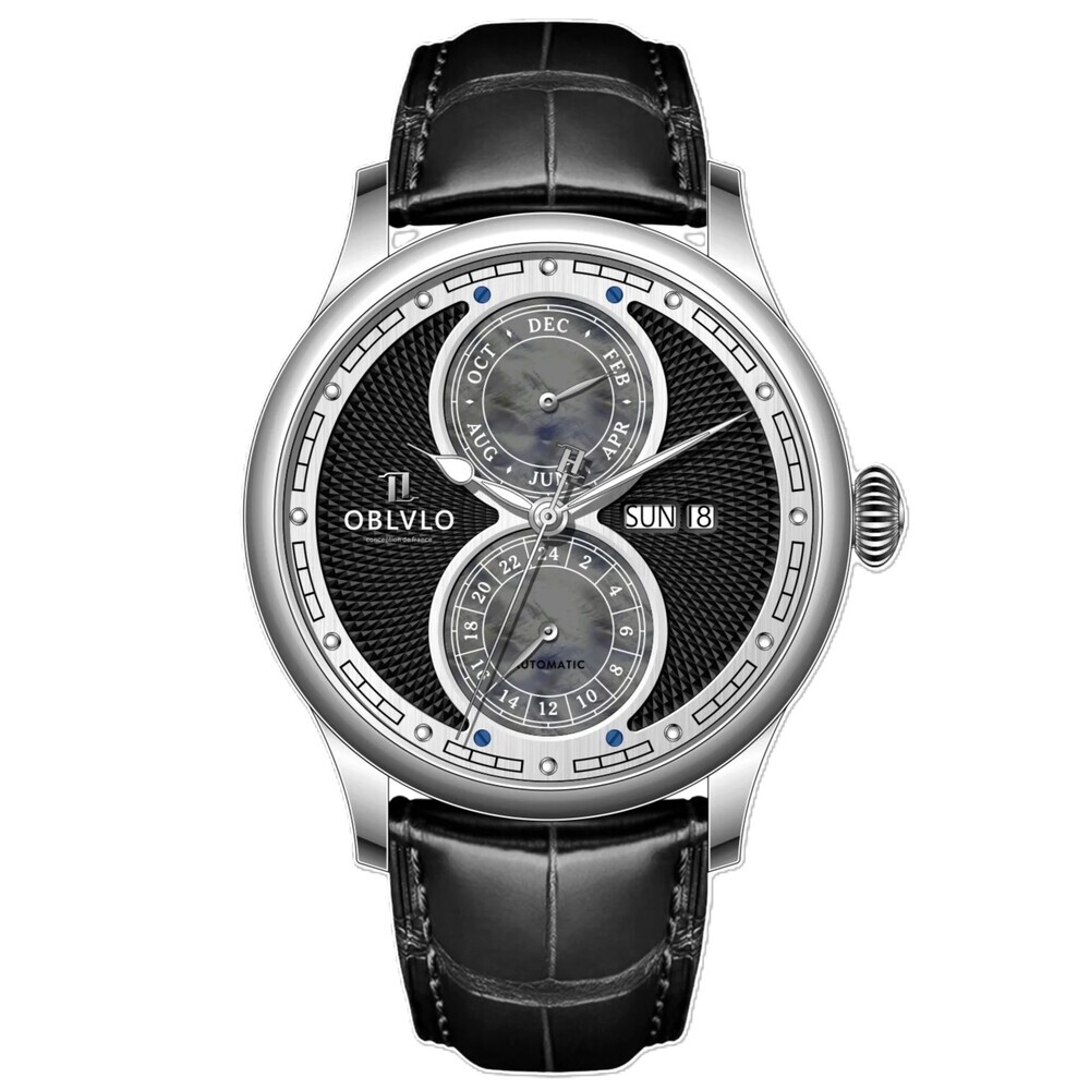 ✦多功能顯示系統:位於三點鐘位置的星期與日期雙顯示窗,提供直覺的讀時體驗,與盤面上的雙小錶盤共同構成了平衡的視覺美感。