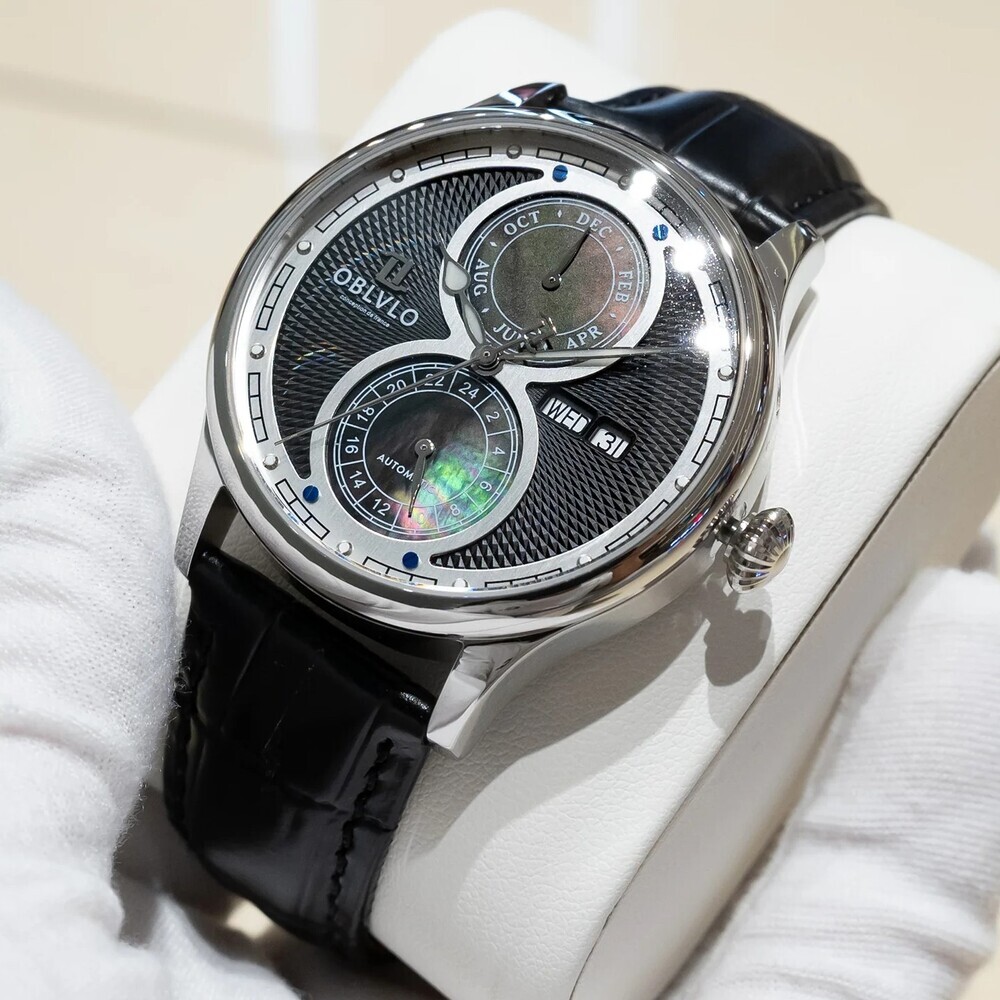 OBLVLO歐弗洛【雙曜典藏】將百年的傳統工藝與大自然的天然饋贈融合在一起。每一次舉手投足,每一次低頭讀時,你都能看見那道如彩虹般的波光在母貝盤上跳躍,感受到格柵紋理帶來的穩定力量。