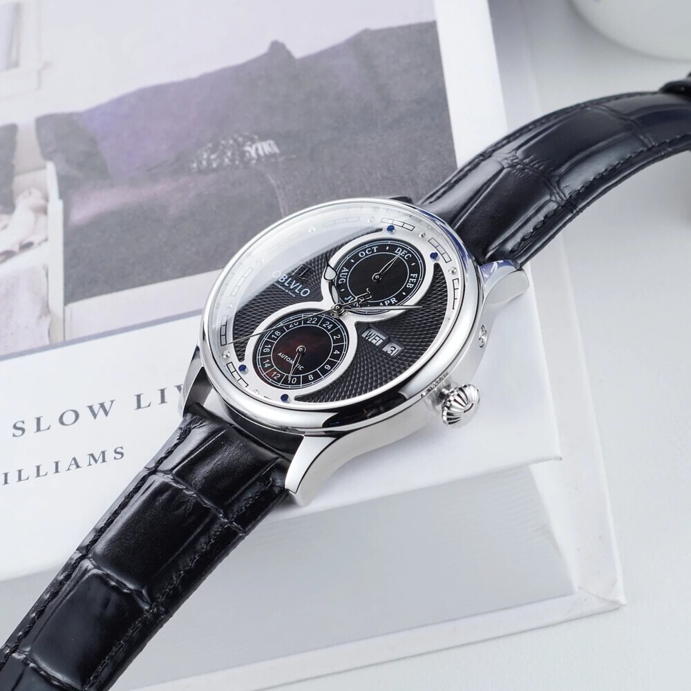 ✦精鋼與皮革的交響:經過精密打磨拋光的鋼製錶殼,其冷冽的屬感與細膩的皮革錶帶緊密貼合,勾勒出佩戴者剛毅中不失優雅的個人特質。