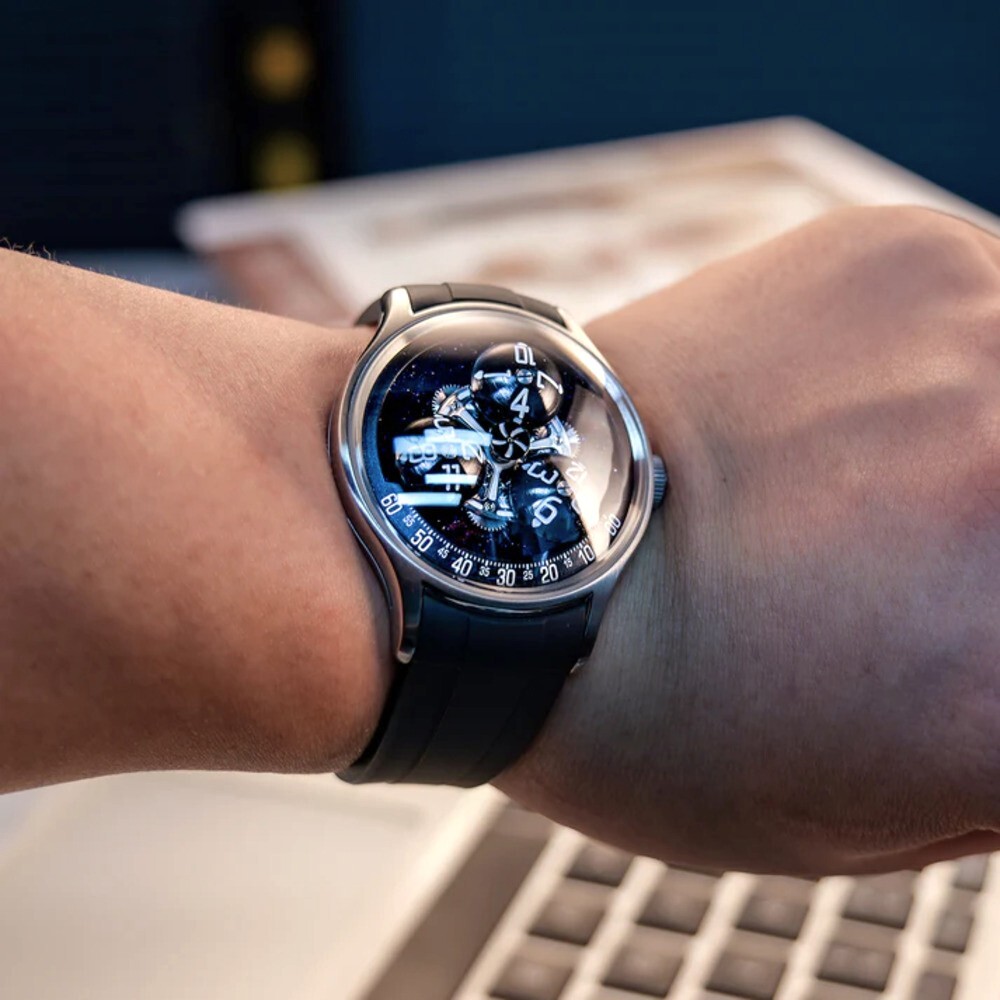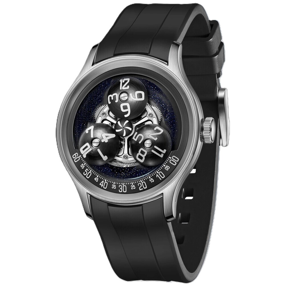 這款【Trisome 星球三體】三顆立體旋轉數字模組,如同行星般在軌道上運行,以前衛的方式呈現小時與分鐘。每一次轉動,都像是一場星體的運行秀,精準又獨特,顛覆了傳統讀時的體驗。搭配錶盤中央精密的機械結構,展現出令人讚嘆的工藝之美。