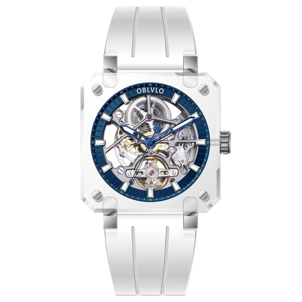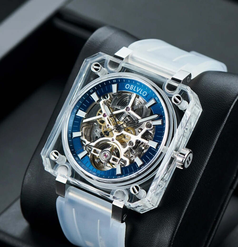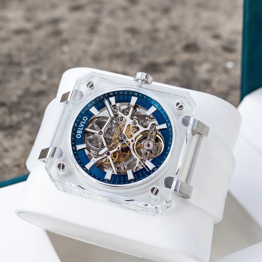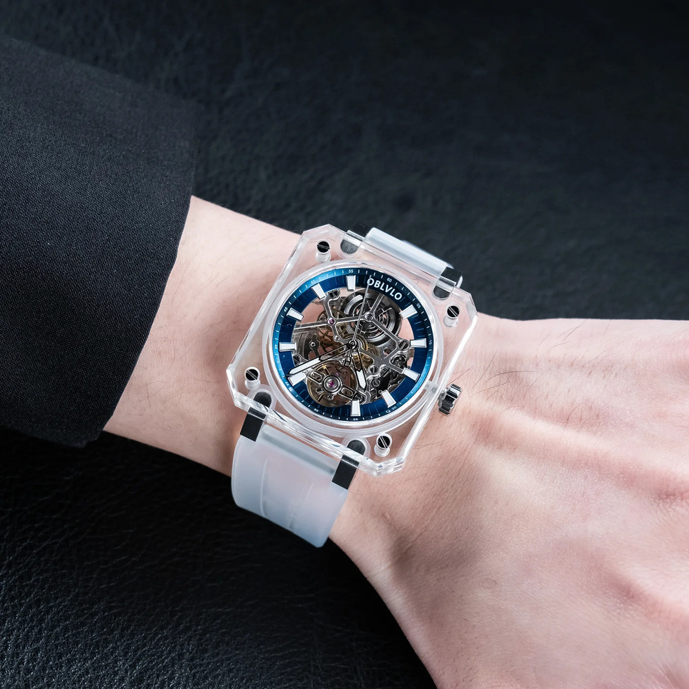 OBLVLO歐弗洛【晶透冰河】以冰塊為設計起點。錶殼採用全透明結構,線條俐落、邊角分明,如同經過精密切割的晶體。光線穿透其間,不被阻擋,也不被誇飾,只留下最真實的折射。時間不再被包覆,而是被完整呈現。