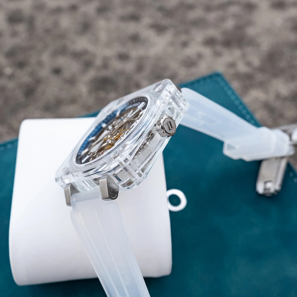 錶帶選擇霧白半透明材質,延續冰晶語彙。柔軟中保有張力,輕盈卻穩定,佩戴於腕間,如同將一段低溫時區納入日常。它不奪目,卻在靠近時顯現細節。