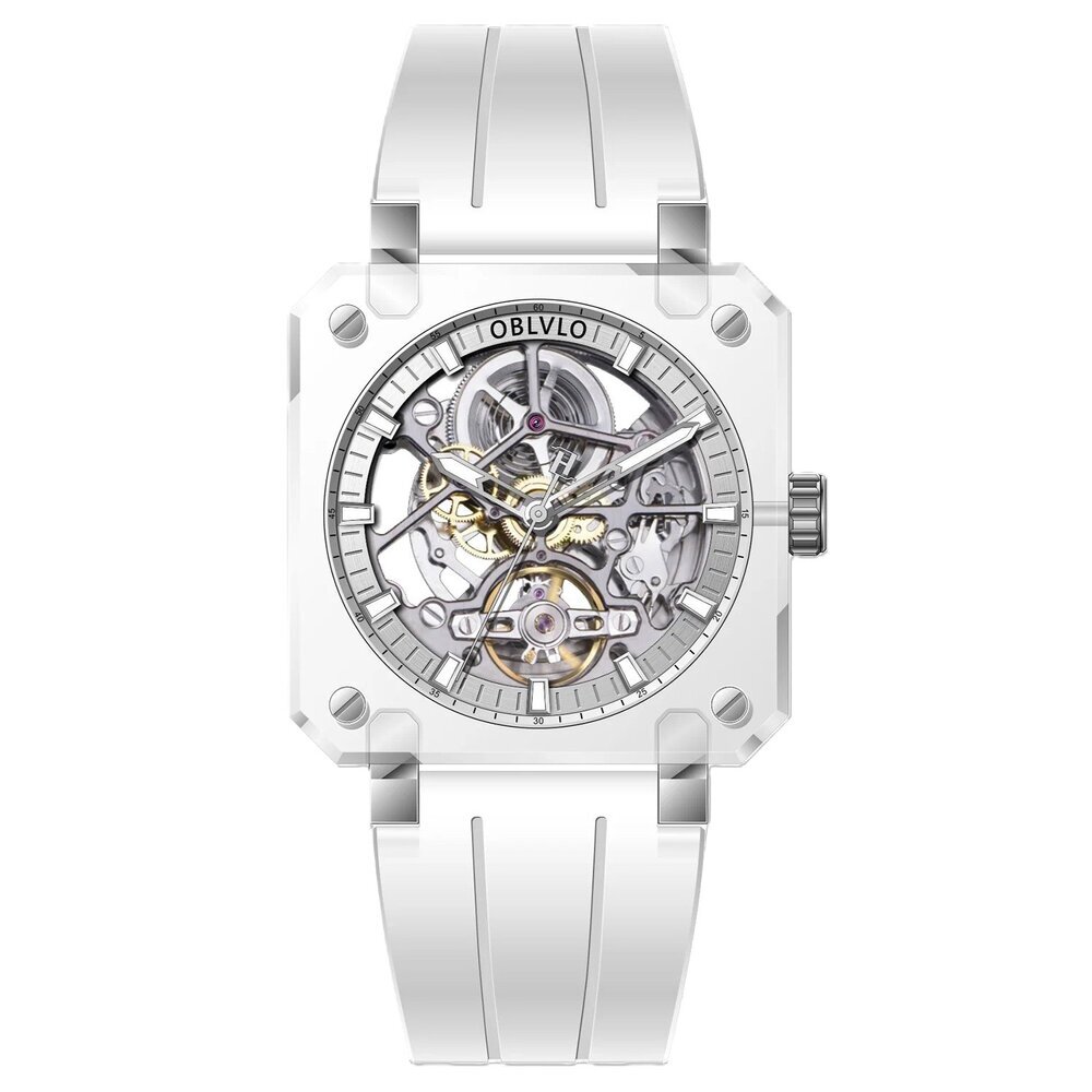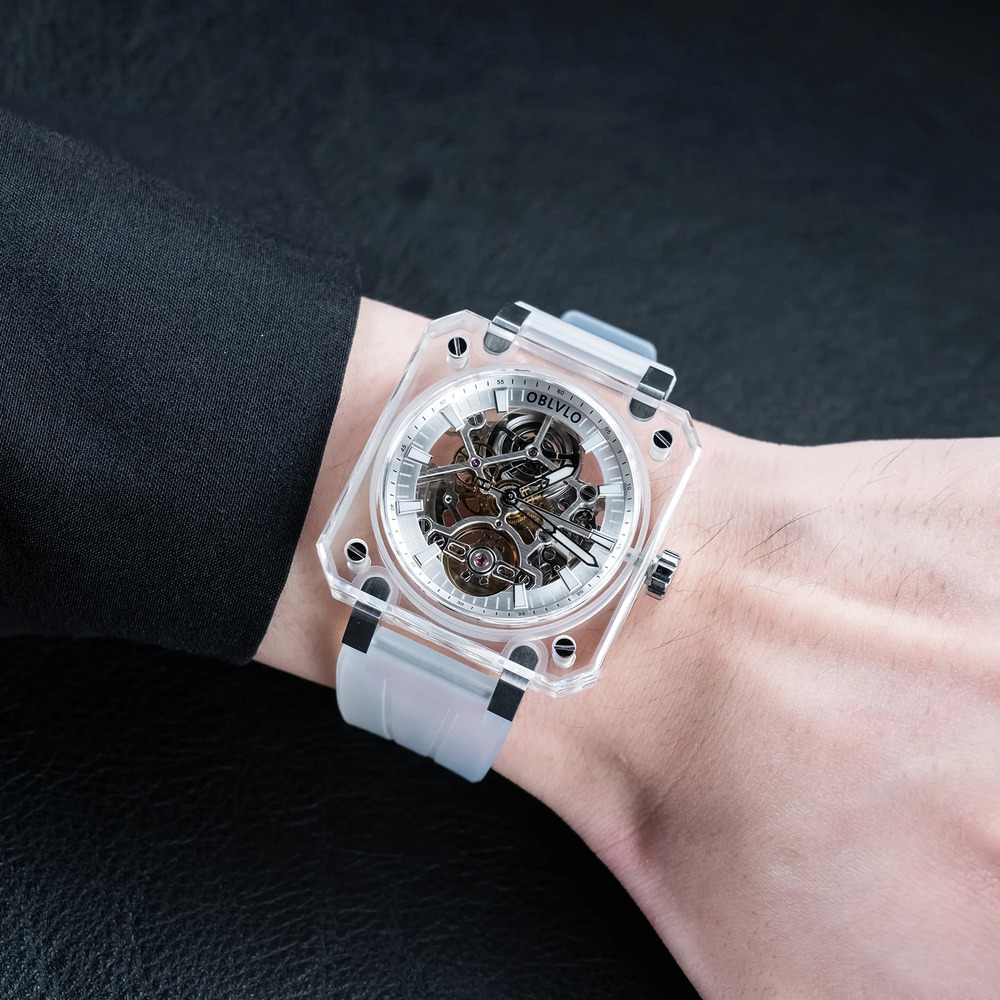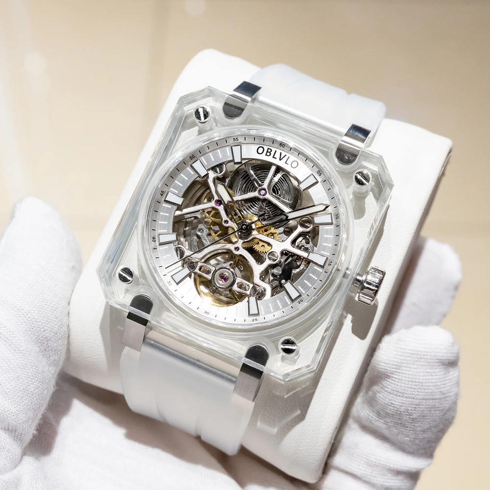 OBLVLO歐弗洛【晶透冰河】以冰塊為設計起點。錶殼採用全透明結構,線條俐落、邊角分明,如同經過精密切割的晶體。光線穿透其間,不被阻擋,也不被誇飾,只留下最真實的折射。時間不再被包覆,而是被完整呈現。