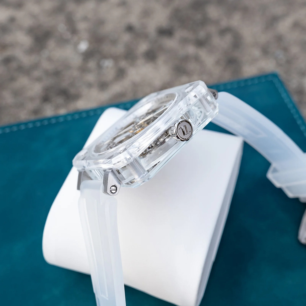 錶帶選擇霧白半透明材質,延續冰晶語彙。柔軟中保有張力,輕盈卻穩定,佩戴於腕間,如同將一段低溫時區納入日常。它不奪目,卻在靠近時顯現細節。