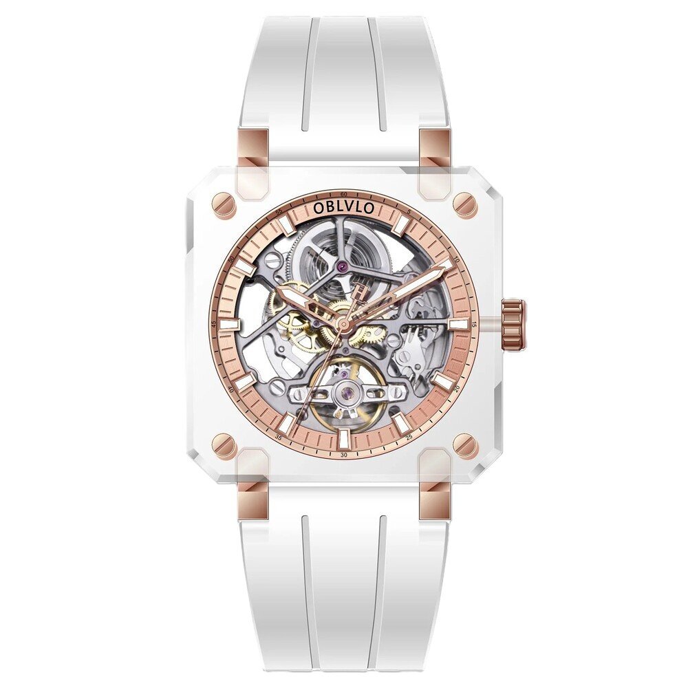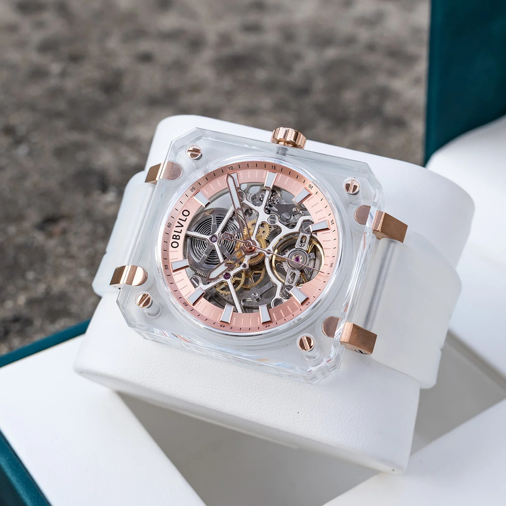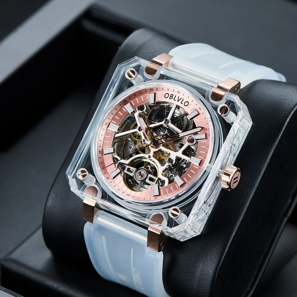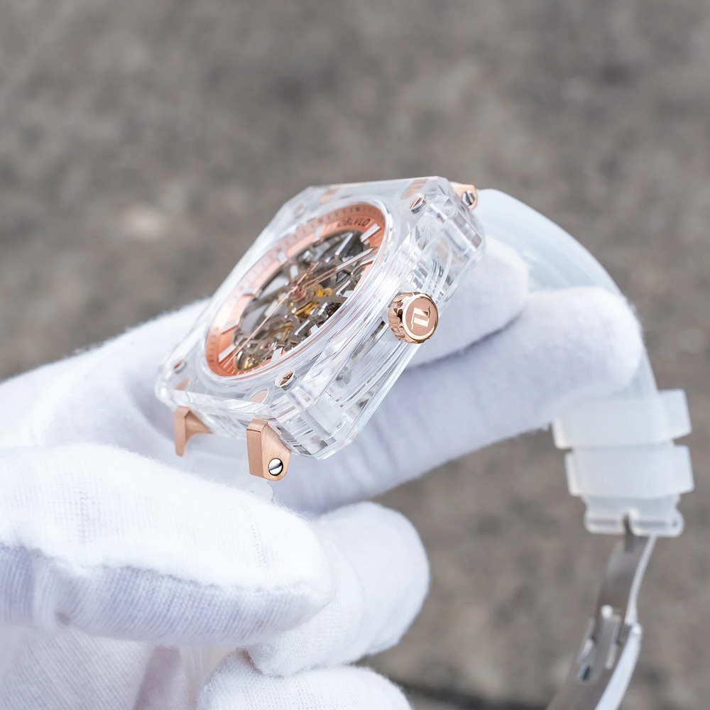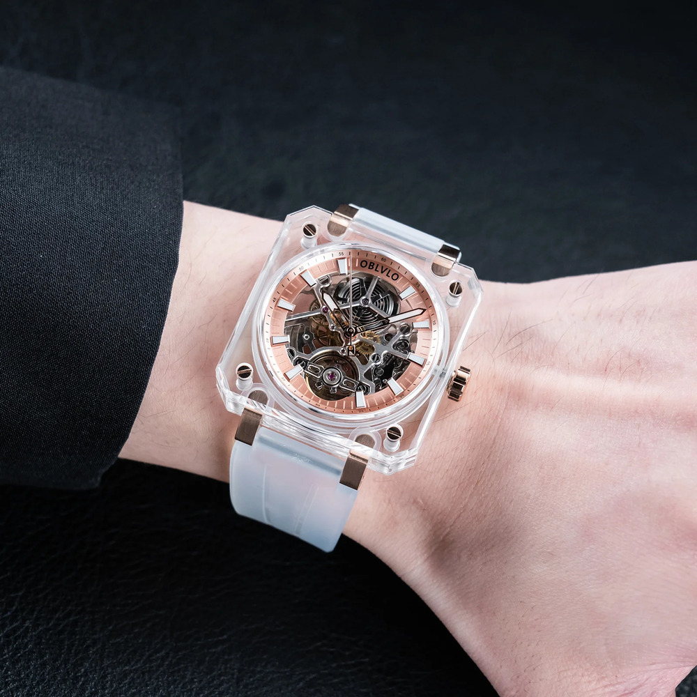 OBLVLO歐弗洛【晶透冰河】以冰塊為設計起點。錶殼採用全透明結構,線條俐落、邊角分明,如同經過精密切割的晶體。光線穿透其間,不被阻擋,也不被誇飾,只留下最真實的折射。時間不再被包覆,而是被完整呈現。