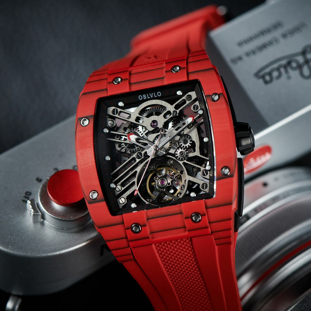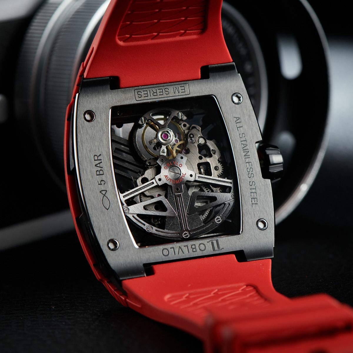 OBLVLO歐弗洛【EM02碳纖維】系列為品牌最受歡迎的款式之一,經典的酒桶造型錶殼,運用繁複的鏤空元素搭配出層層堆疊的錶盤設計,充分展現機械美學與眾不凡的魅力!